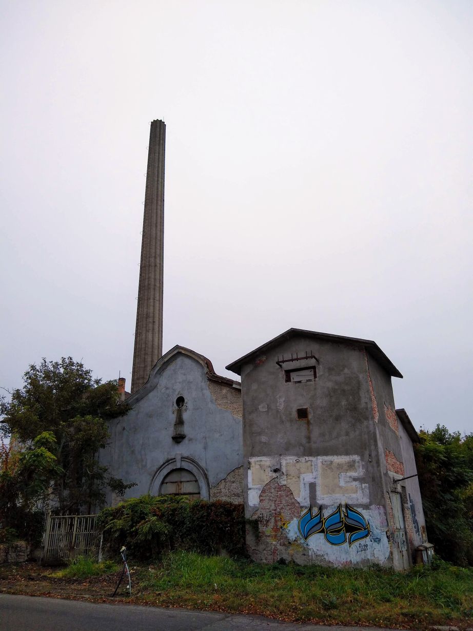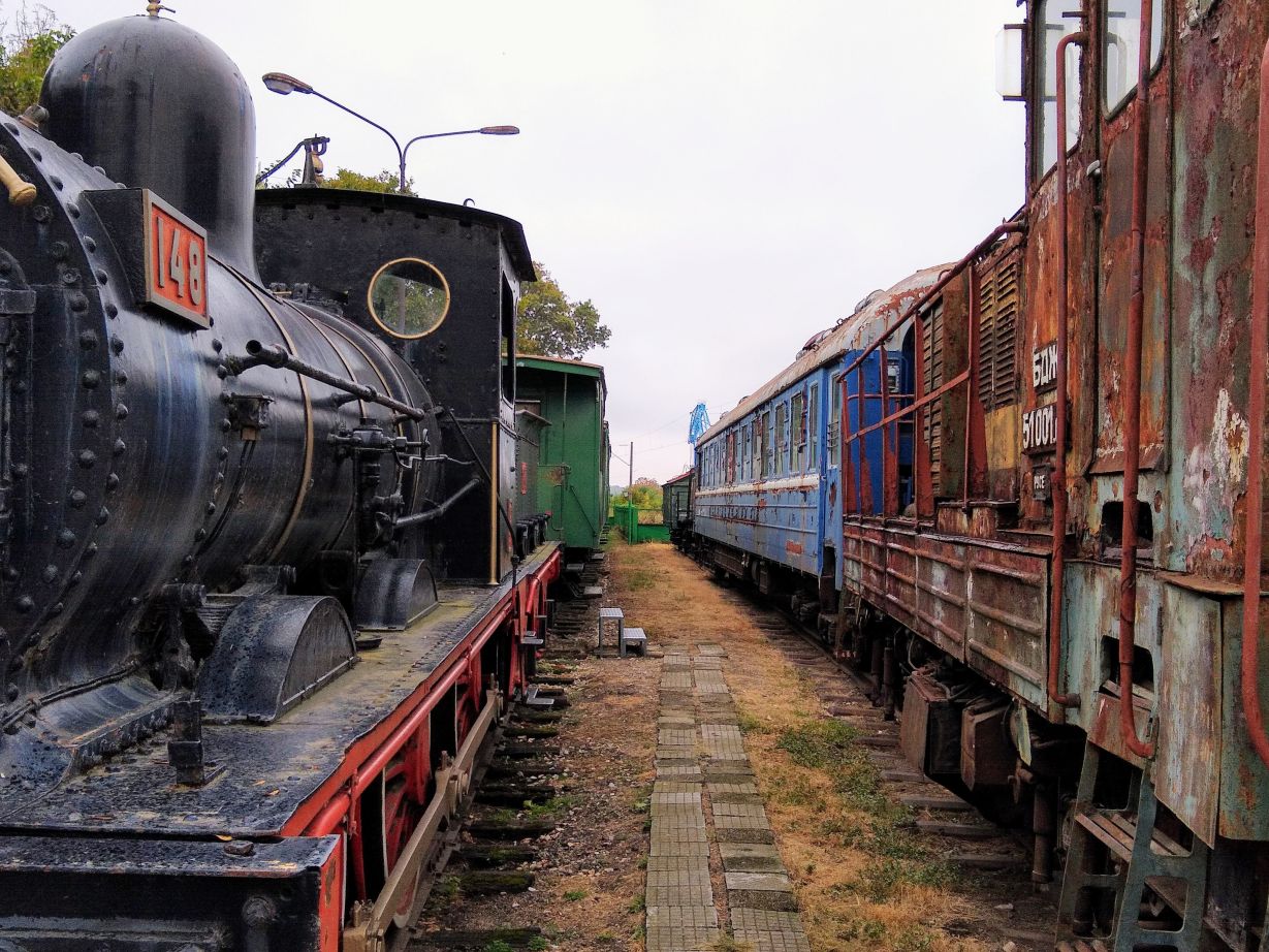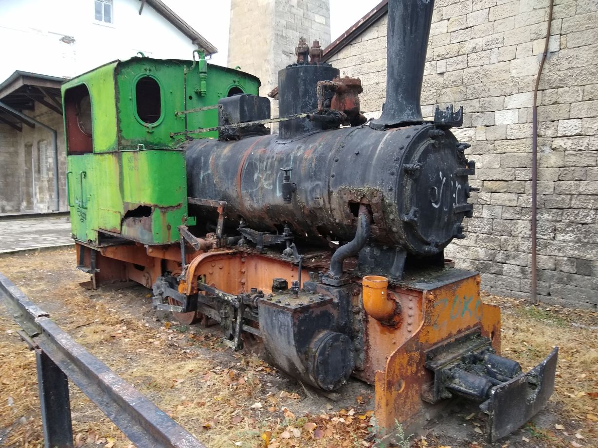 We walk for about 15 minutes, winding our way through the park, then take a wrong turn (or actually don’t turn) and find ourselves in this dead-end compound of ramshackle stone houses and ominous looking abandoned cars. Oops! Turning around we find our pathway, an overgrown set of stone steps leading down to another little road that leas to the road fronting the river where the museum is located. The road doesn’t look much better, to be honest, but in for a penny, in for a pound, and right up ahead (after the set of dilapidated buildings on our left) rises the Train station tower with an old train engine right out front. Phew! Found it. Now, just the challenge of getting in remains!