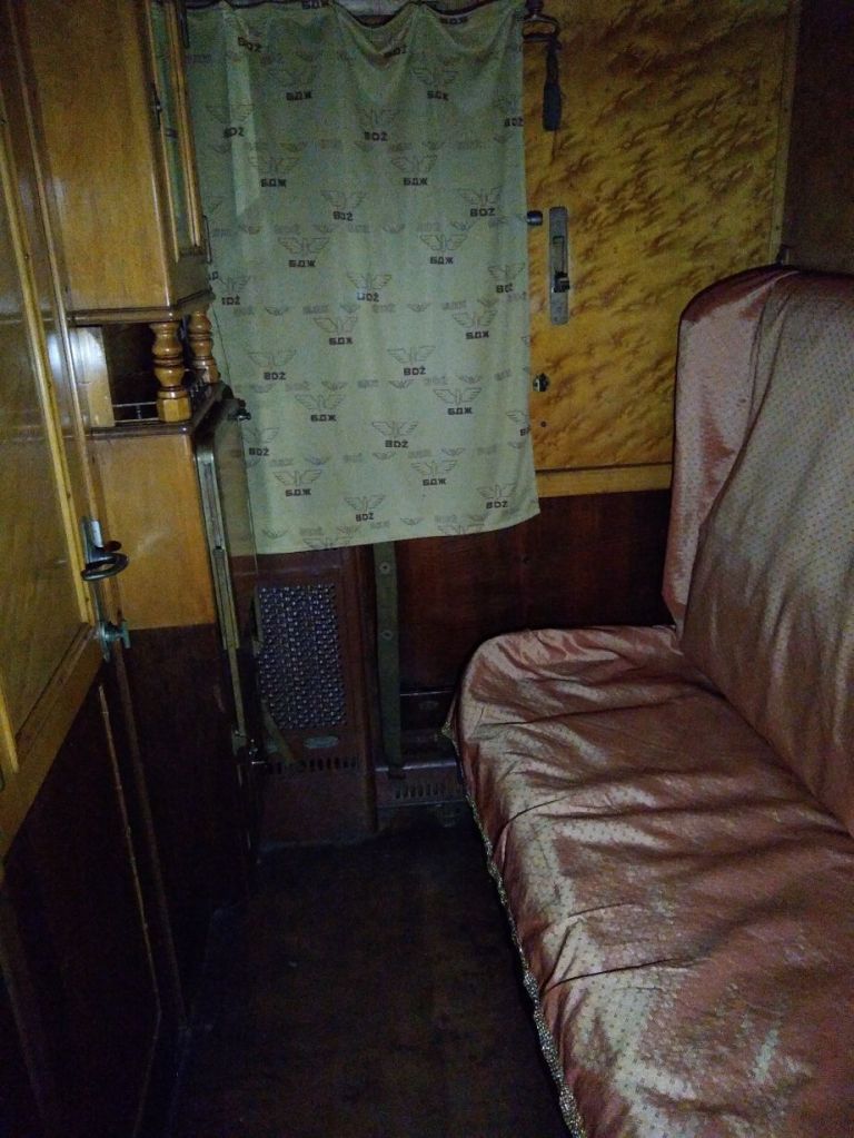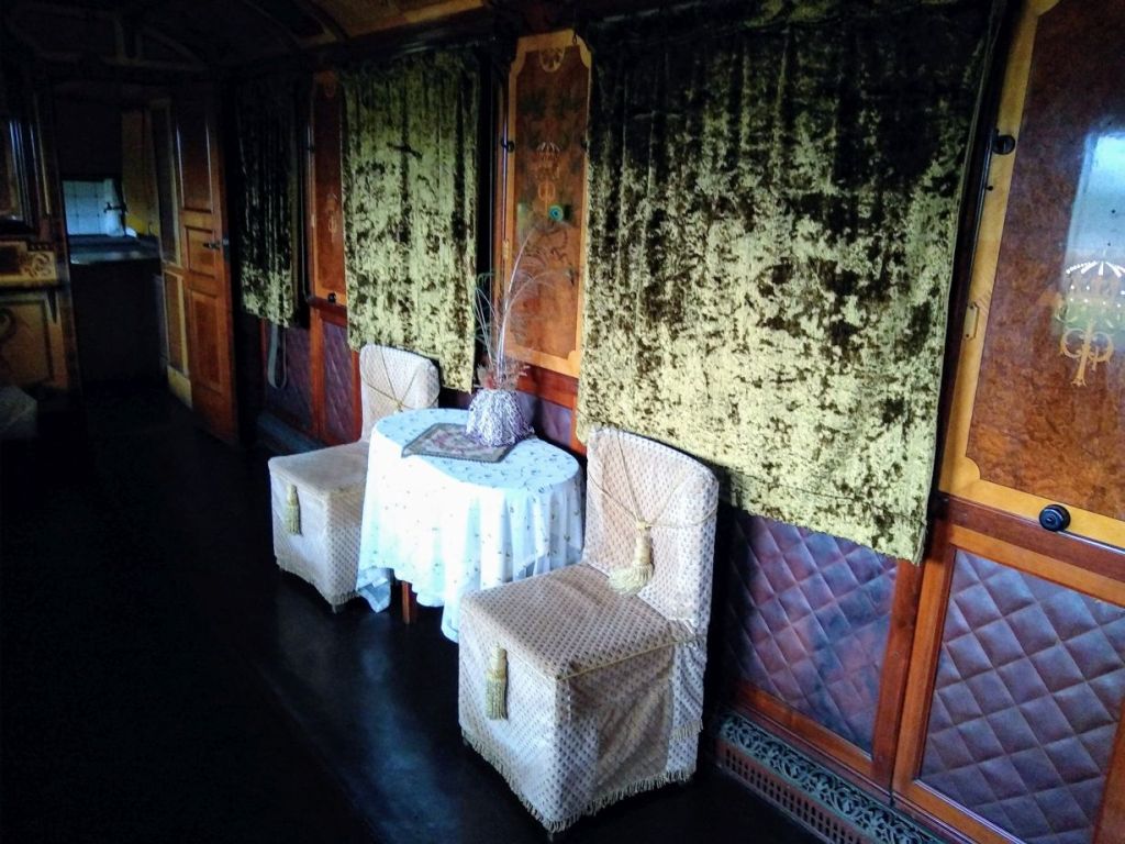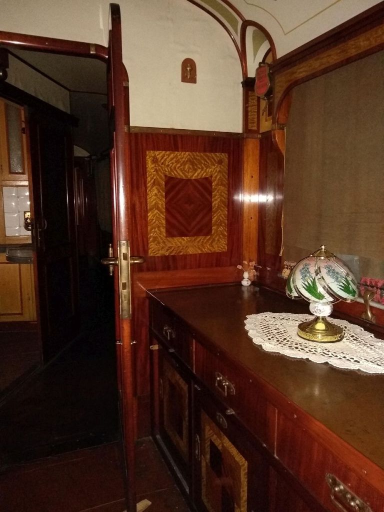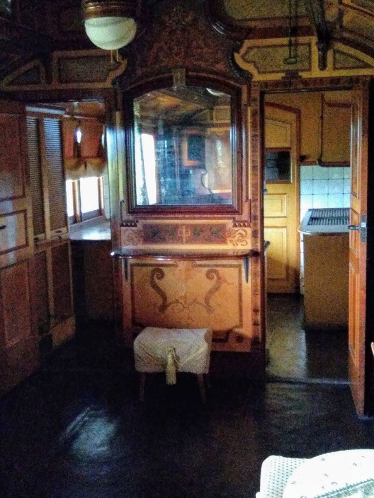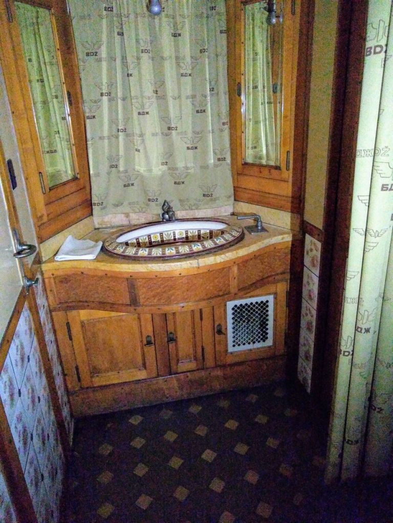 If we were besotted before, we are totally over the top now! There are 10+ steam engines out here, including the oldest in the country. But the piece de resistance are the personal train carriages of King Ferdinand of Bulgaria, King Boris III of Bulgaria and the Turkish Sultan from 1866. They are lined up one right after the other under a huge garage roof, and our sweet phone-talking caretaker unlocks one after the other for us (along with the bathroom for Ed). They are amazing in their opulence and in their completeness. From incredibly tiled bath areas to fully equipped kitchens, butler’s pantries and dining cars, we spend the better part of 30 minutes just exploring all the nooks and crannies we can find. All the while imagining ourselves traveling in such splendor all those many years ago. Yeah, right! Ha! (Warning: TONS of boring train pictures below – boring that is if you aren’t into trains as obviously we are!)