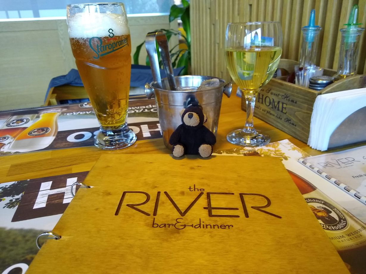 It’s barely 2pm and we don’t have to be back aboard until 5:30, so we figure we’ll hit another museum before we call it quits, but first, we’re thirsty, so a beverage stop is next on agenda. As we make our way toward town in a light drizzle, we happen upon The River, which looks like a lovely place to hang out for a beverage. (Ok, no we didn’t just “happen upon” this place, we researched it an had it on our route all along, but, well, you know….creative license and all that.)