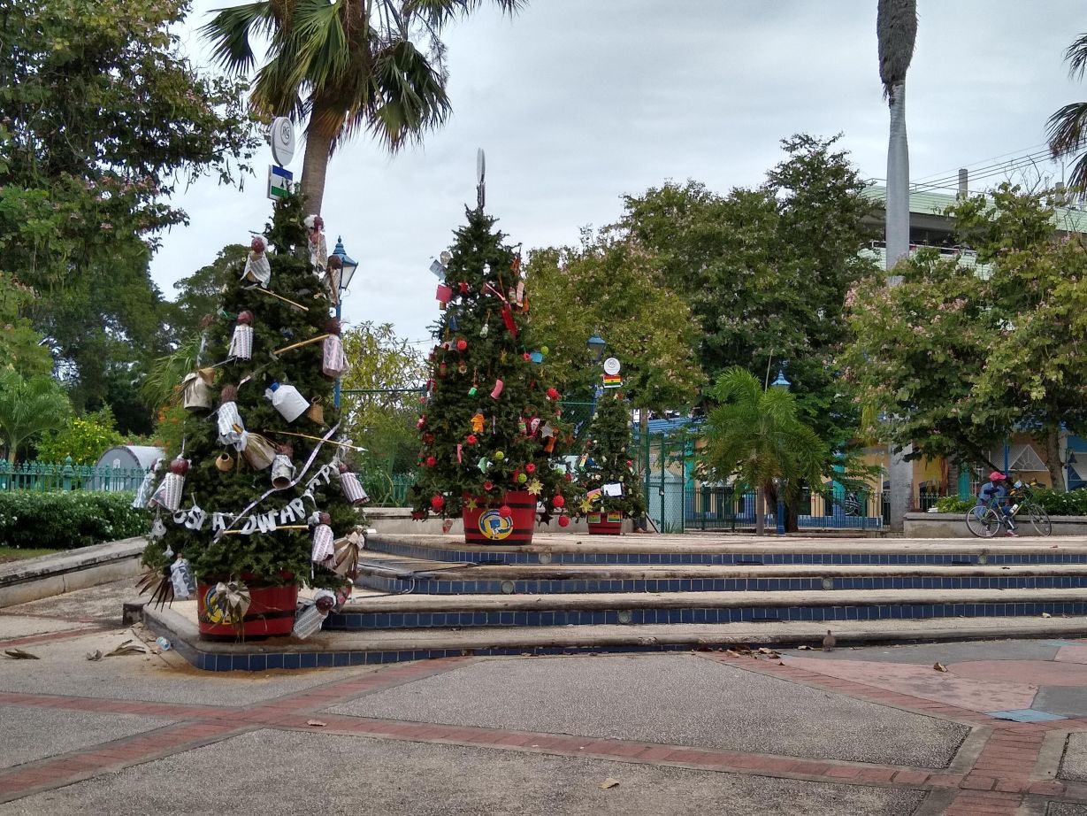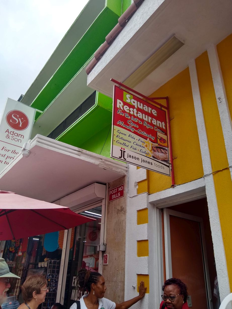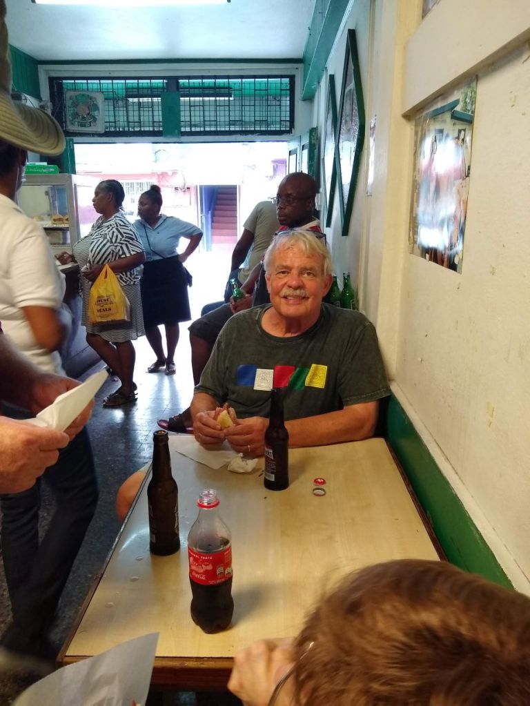 It’s a hot and muggy day today, with clouds that look like they are ready to burst any minute. We’ve a relaxing morning planned, just hanging out, coffee only because at 11:00 we have a food tour in Bridgetown – no sense ruining our appetite! We leave the ship a little after 10, knowing we are too early, but not being able to sit around any longer. As per usual, we are threaded through the shopping mall on the pier before being able to get outside to the waiting vans and shuttles that are lined up 15 deep at the terminal. We find the cheap shuttle easily enough and manage to secure the last good seats (before they stuff on 4 more large individuals who have to squeeze into the rear seats) then are off into town lickety split. On the way we are scoping out the supermarket situation for beer – but we may be out of luck today. The large market we checked out on the map is equidistant between the pier and town, and it may be too much of a walk for us after our Devil’s Island adventures.