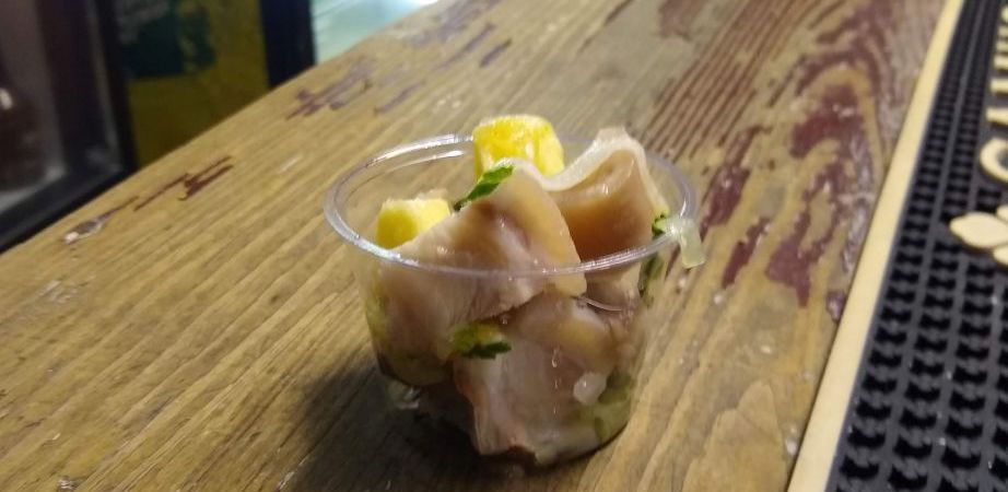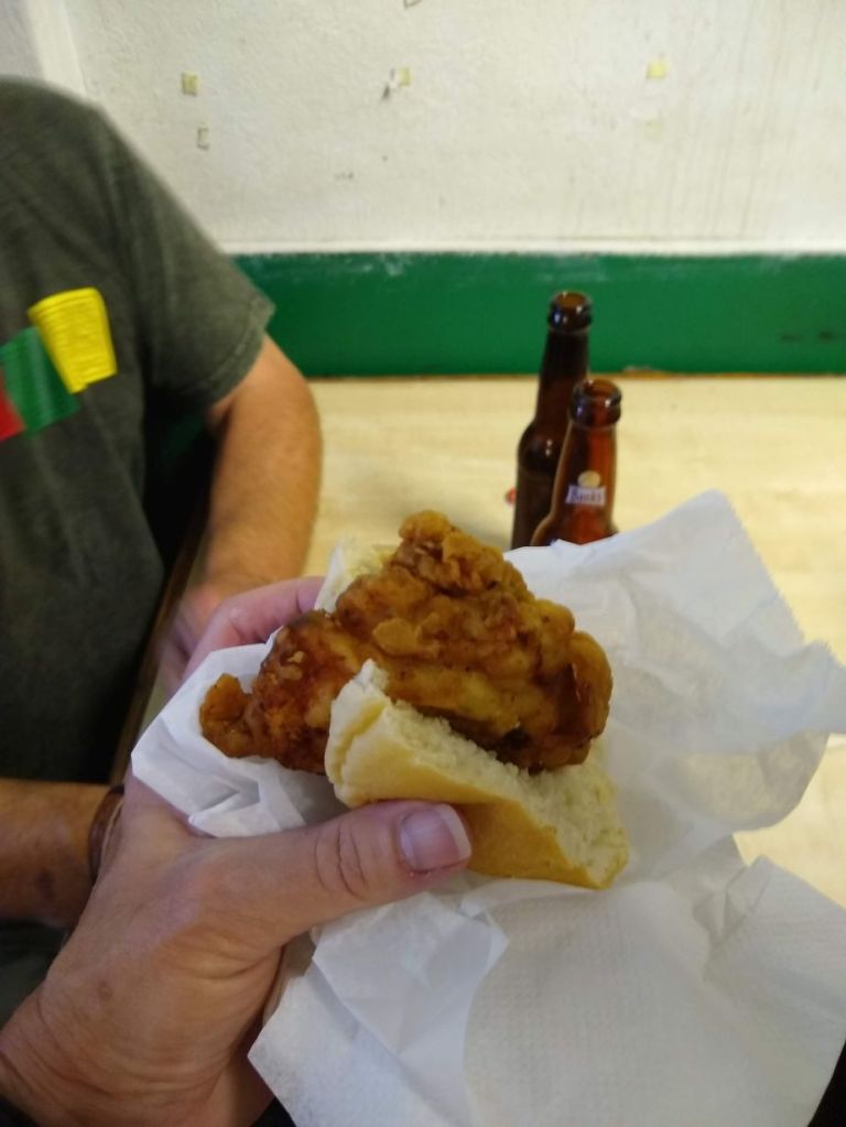 The second course here is much better than the darn souse, fortunately. We share cutters, which are little sandwiches made on small salt rolls. We have a ham sandwich (better cut of pig this time) and a fried fish sandwich that easily wins best dish here (in my opinion). It’s fun to try everything and joke with guy behind the bar and the lady who offered me the trash can.