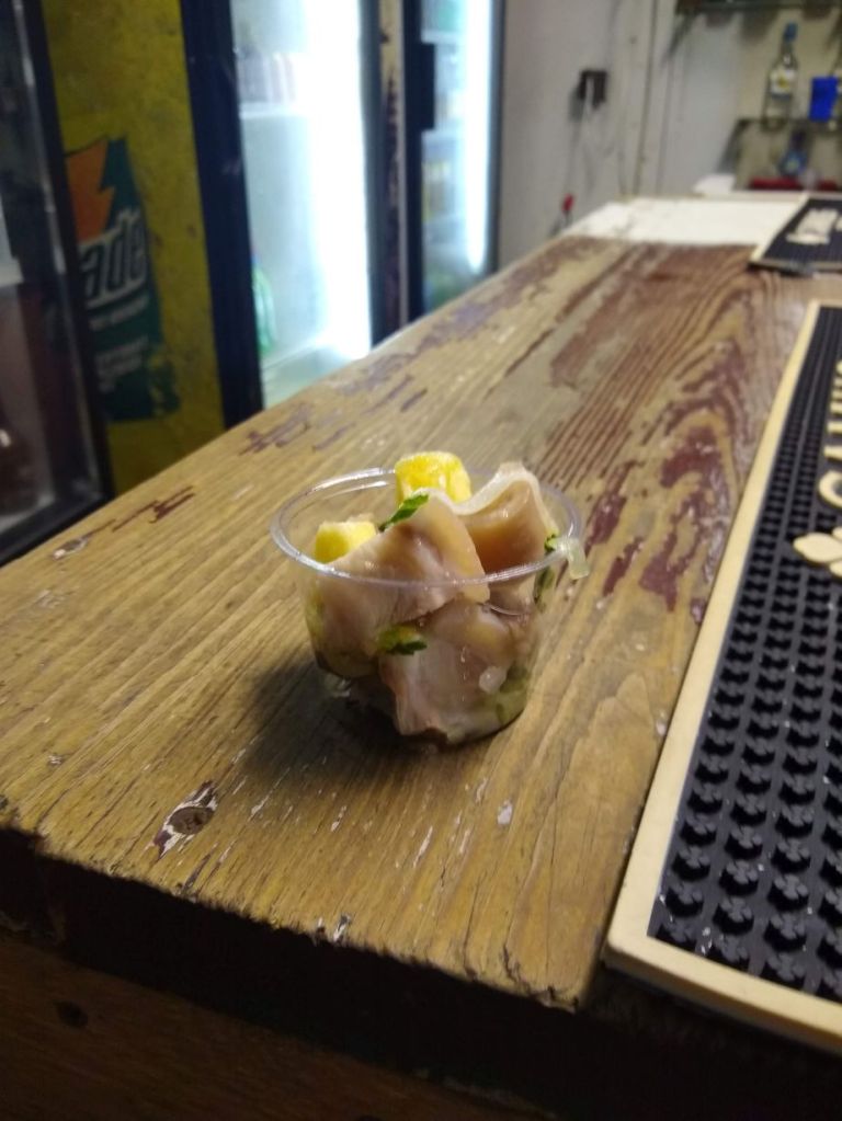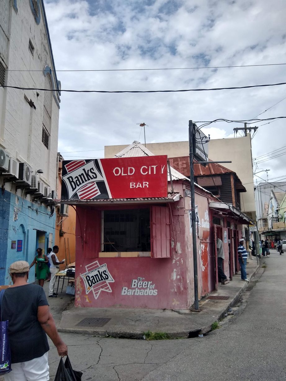 Then, before reaching our final restaurant, we stop at the oldest bar in all of Barbados, The Old City Bar. Once again – a local’s spot! We don’t exactly get dirty looks, but we don’t get very welcomed by the old guys hanging out at the door. But hey, we don’t care, we have Nicola who is shepherds us right in the door and gets us our Banks beer. She knows everyone (and I mean everyone – she has been stopped, or stopped people, on the street every 2 or 3 minutes to say hello and chat!), and we talk about what a small island this is as we stand in the narrow space between the bar and the front doors (in front of what looks like an old refrigerator case and menu signage – we’ll eat in a whole lot of places, but we have to say that this is not one of them).