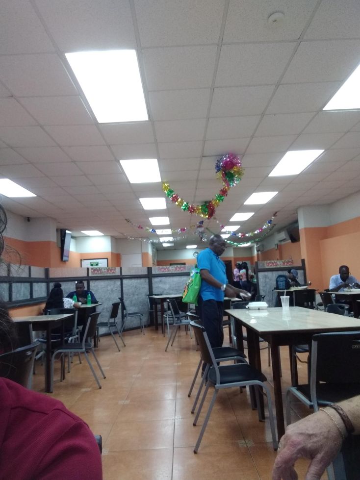 Turning around, we head back toward the center of town and the long pedestrian shopping street – Swan street. It’s like a huge flea market here, all the stores have stalls out on the pavement, vendors have all sorts of trinkets and clothes and other daily necessities. After a block, we turn into the entrance to The Square Restaurant, a little cafeteria type place located on the 2nd floor of a building, above the retails shops. We make ourselves at home at a little table at the back in between 2 tvs showing cartoons and wait for Nicola to bring us our next treat: Cou Cou. This dish is totally traditional and very much like Polenta, only better. This dish is cornmeal and okra, cooked and stirred with a cou cou stick, which Barbadians say is the only way to stir the cou cou to have it come out creamy and correct. This particular version is served with chicken and gravy – and is absolutely delicious. You can’t even taste the okra, you can see the bits of it, but it isn’t slimy or pungent, it just really ads some texture. Excellent in every way (I didn’t even bother with the chicken, just ate the cou cou).
