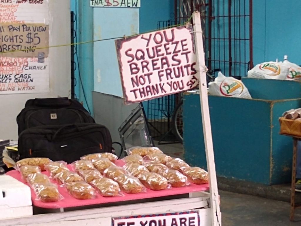 After a lengthy and lively discussion about a bunch of esoteric books Nicola is reading, we find ourselves out on the street again, dodging vendors heading toward the waterfront. We cut through a produce market, taking delight in the sign that says “You squeeze breast, not fruits. Thank you.” Gotta have a sense of humor!