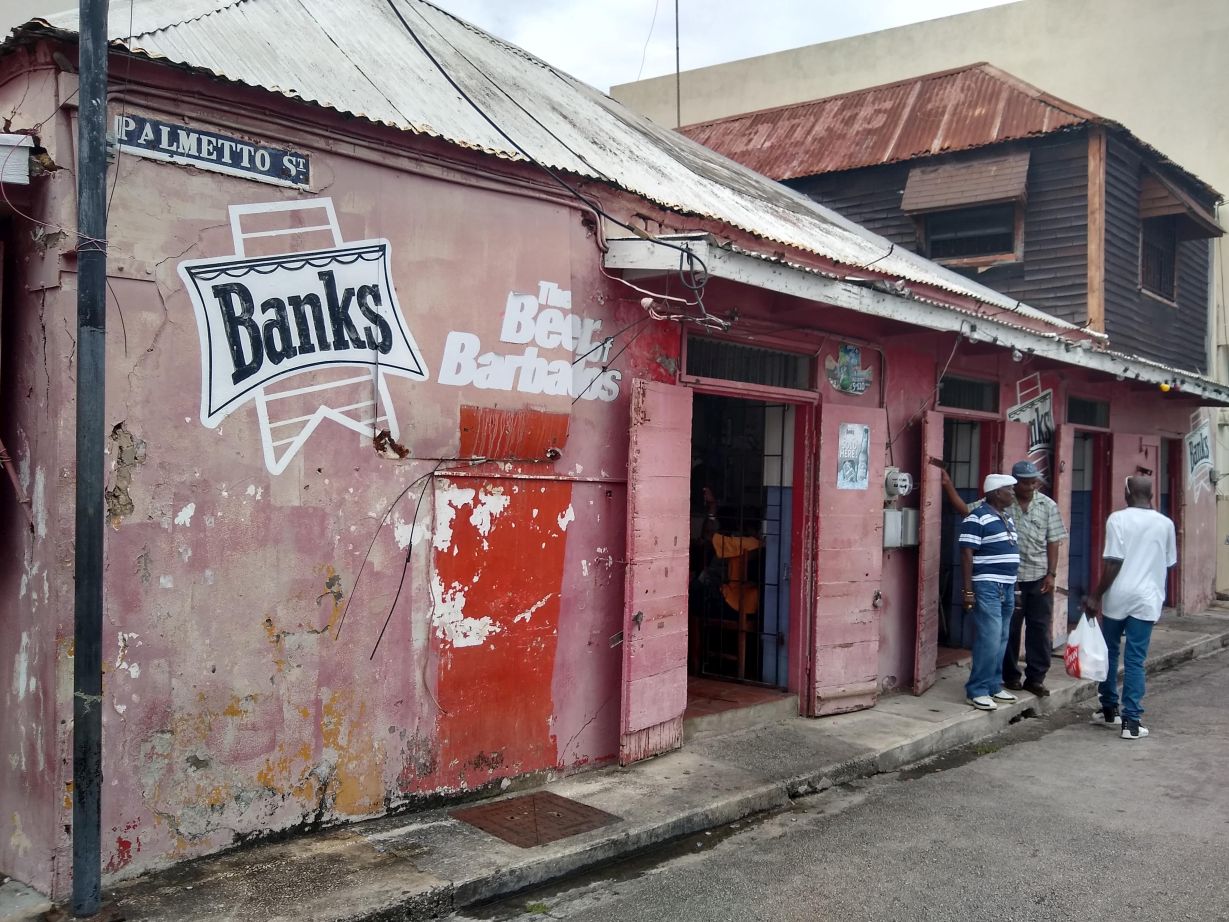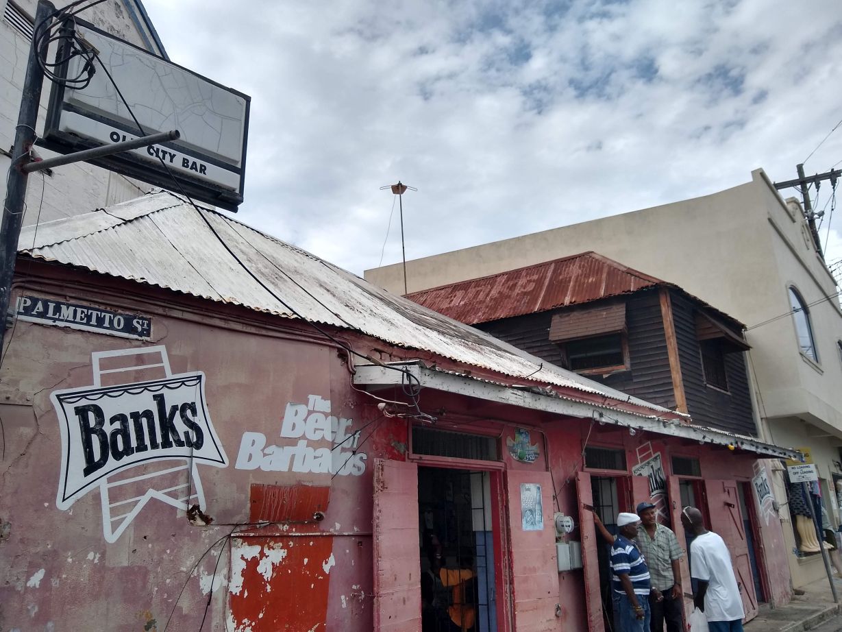 And it is our guide, Nicola, talking to a couple from the ship who are also taking this tour. They are from – wait for it – Hendersonville! Right down the road from us! Talk about a crazy small world. Introductions and signed waivers completed, we head off with Nicola through the bustling streets of Bridgetown to our first stop, Hunter’s Bar. This place is totally a dive local hangout, we’re the only non-Barbadians here. It’s a narrow little counter service place with barely anywhere to sit, but they’ve got Souse – the famous pickled pig dish that we’ve read all about. What could be better? Pickling and pork? Well, for me, just about anything because sadly all the pork are the parts I’m just not too wild about – you know, snouts, feet, ears, anything that’s left over after the good stuff is gone! Bummer! Because the taste is fabulous, but the consistency – not so much. Fortunately we’ve ordered Banks beer (the local beer), so that helps wash it down a little. We’re stuffed in the back of this little place and a local lady is sitting in the corner, watching me try to eat this stuff. We exchange pleasantries, and when she sees I just can’t do it, she surreptitiously points out the garbage can for me and then the 2 of just start laughing as I ceremoniously toss the offensive pig parts out! Totally funny.