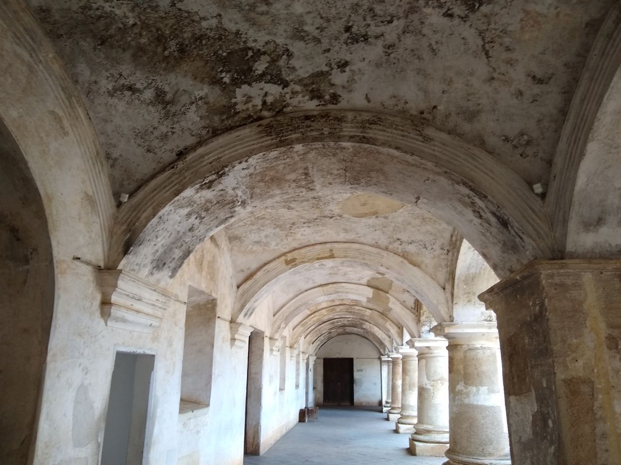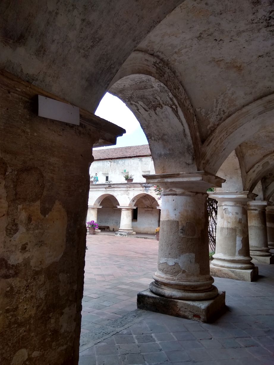 After a brief stop inside the active and restored main cathedral, we walk the few blocks up Avenue 2a for the next stop on our ruin tour: the Church and Convent of the Capuchinas Nuns. Once again, the convent was badly damaged in and thus abandoned after the 1773 earthquake. While in existence, however, the convent was widely used and quite full, as it was the first order that did not require women to pay a dowry to enter religious life. The nuns here ran a women’s hospital and an orphanage being moved to the new capital main city of Guatemala after the earthquake. Since then, the Diocese sold the building and it has been used for various purposes, such as a coffee drying “warehouse” and a dry cleaner. In the mid 1940’s it was repurchased, the main structure restored, and opened to the public. The ruins remain around the gardens, however, including the original “retirement tower,” a first of its kind round tower that housed the nuns in cells with their own toilet and study areas. It is considered the very first apartment in the Americas.
