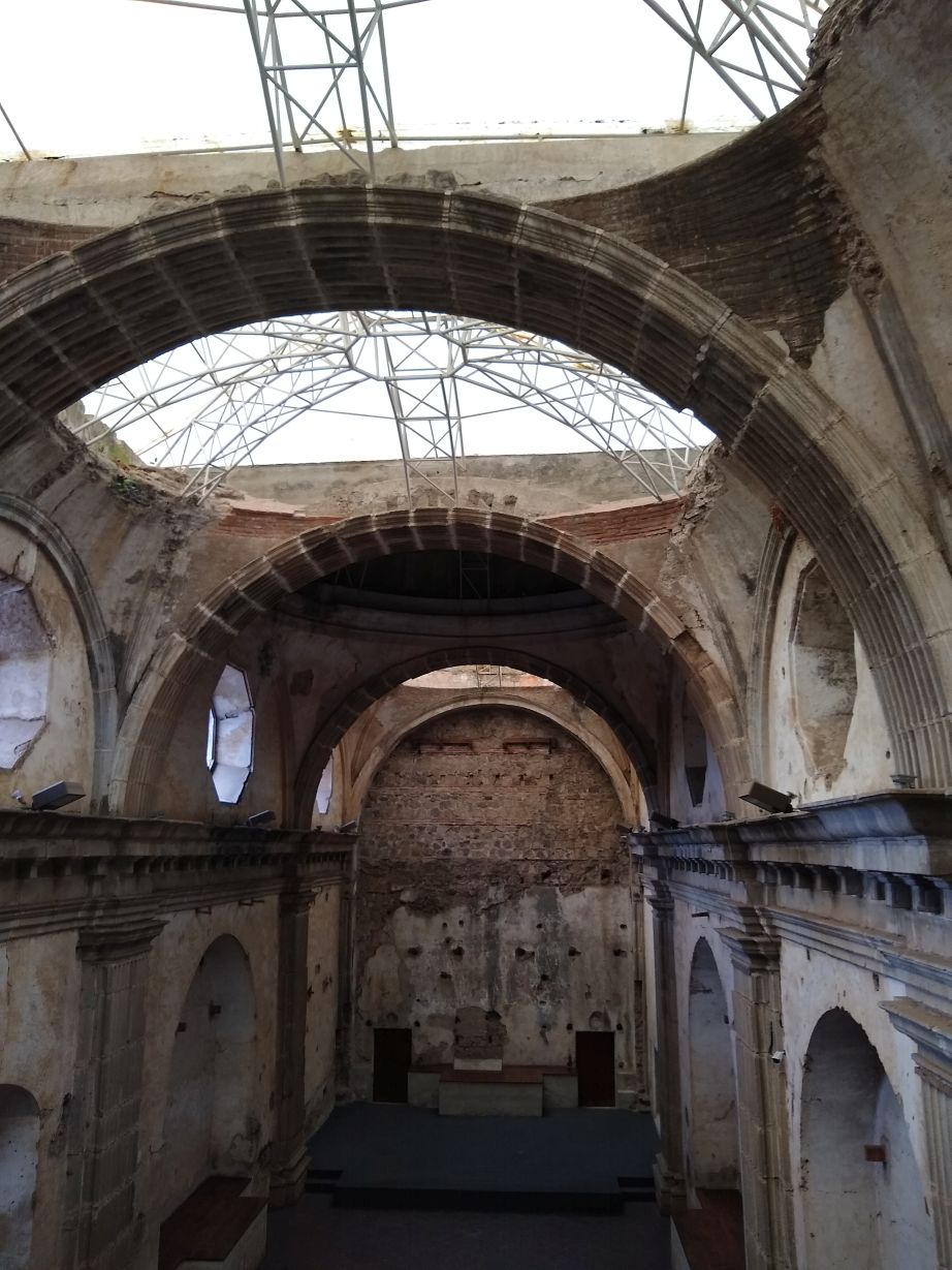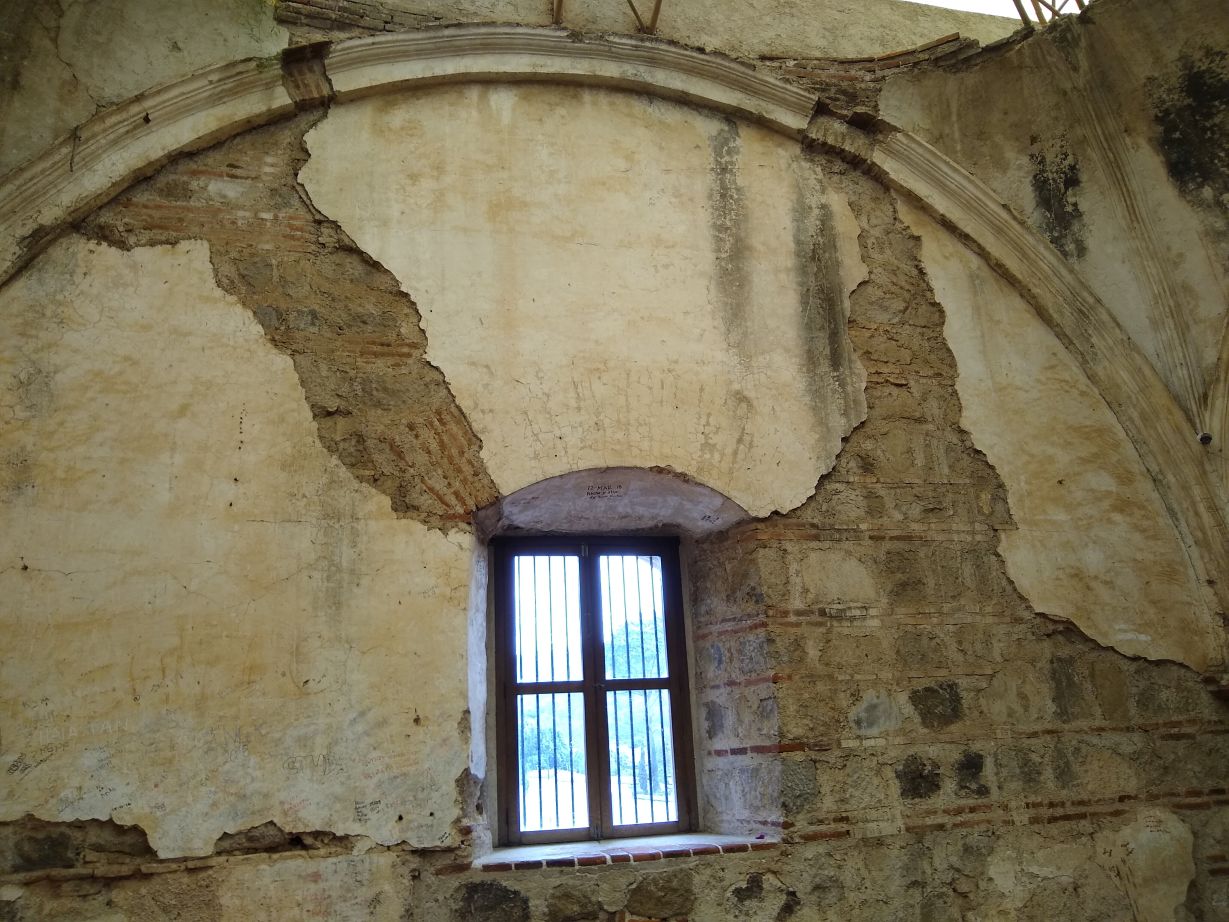 The ground floor contains different work rooms and the refectory, all opening onto a lovely porticoed walk that surrounds a pretty garden. Upstairs are all dormitories and cells for all levels of nuns (from novice on up) as well as a great balcony area that overlooks the what is left of the church (on our first visit here 4 years ago, and today, we could never figure out how to get into the church, or even if it was accessible, so this was our “ah ha” moment, when we realized it was permanently closed and only accessible through the convent). The church itself has been left fairly unrestored, and you can really see the earthquake damage here by the cracks in the walls, the missing stucco not to mention the wide open ceiling where the roof has been replaced with scaffolding to keep the building stable.