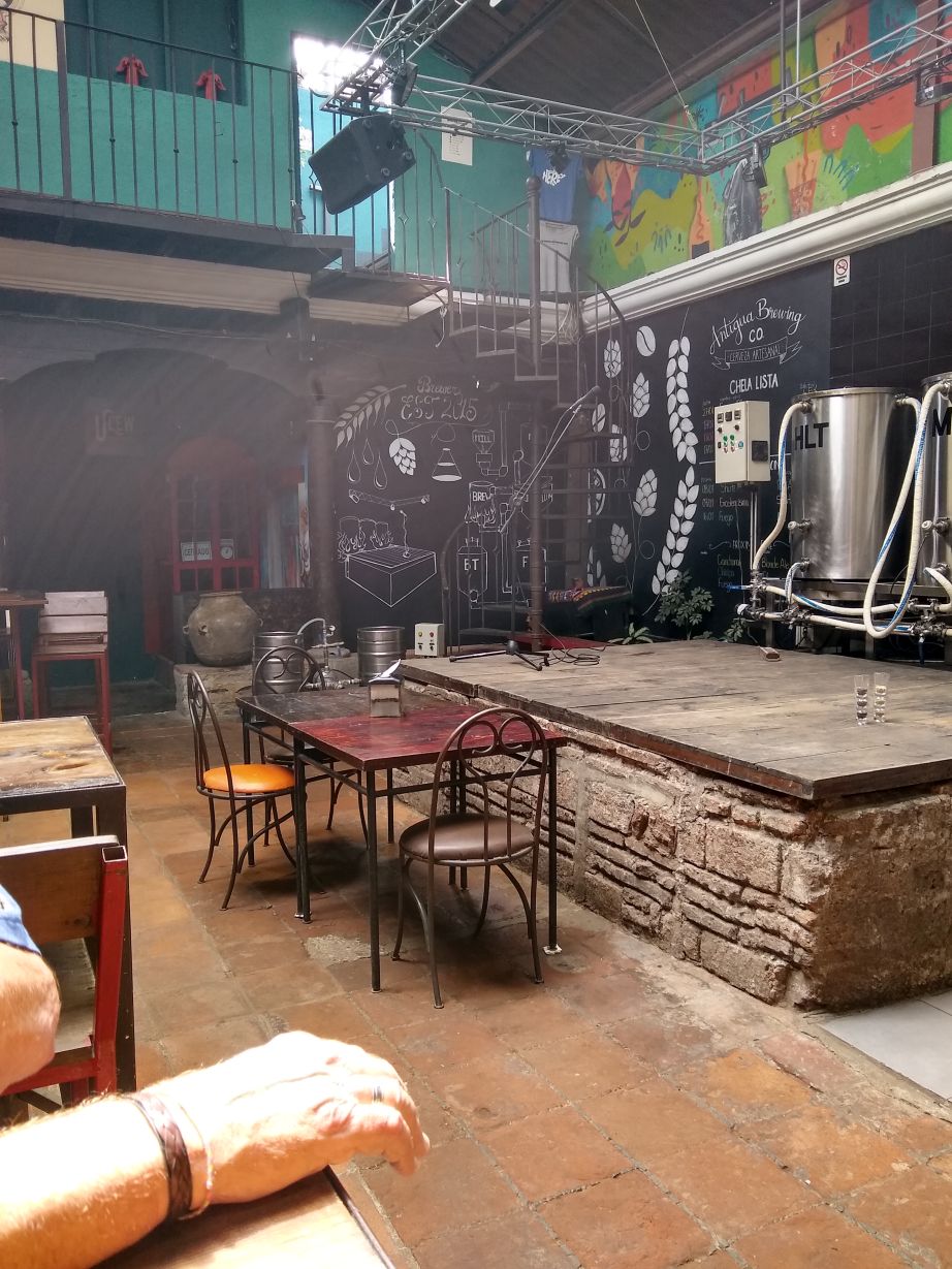 That was an excellent little diversion and lesson in Spanish architecture and earthquake damage! We only wish we had more time to visit the other historic sites here in the city, but with our looming bus meeting time approaching, its time for food and libations. On that order, we head to the Antigua Brewing Company, passing through a great little arts and crafts market where we once again eschew any purchases (we have a long trip ahead of us and precious little room in our cases so we are restricting our buying to absolute can’t-pass-that-up purchases – of which we’ve not found any yet! We’re not even buying coffee…..which is torture….because we simply don’t have the room).