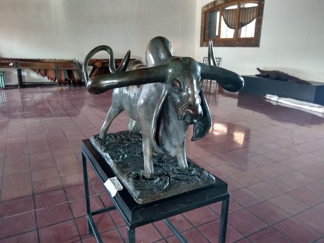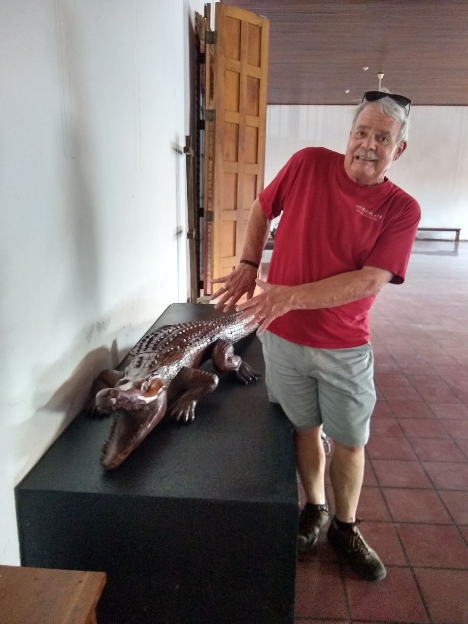 The streets are pretty empty, sort of gritty, and not especially picturesque. But, its a working town, not a tourist destination, at least not international tourists. It is definitely a Costa Rican tourist destination, with the beautiful beaches and lots of guest houses available for rent. We make it to the House of Culture without a problem (the whole island is laid out on a grid so it is really easy to navigate around) and completely enjoy the pedestrian street outside with all the fantastic sculptures, one of which looks just like the small infinity iron sculpture we bought in Bulgaria. Inside, the exhibits are minimal, but nice. I particularly like some of the paintings, and the sculptures are cool – or frightening, depending upon how you feel about crocodiles! Mostly though, it is the architecture that is the exhibition – the open rooms around a large courtyard that currently has a big stage and bleacher seats for theatrical presentations. Pretty interesting.