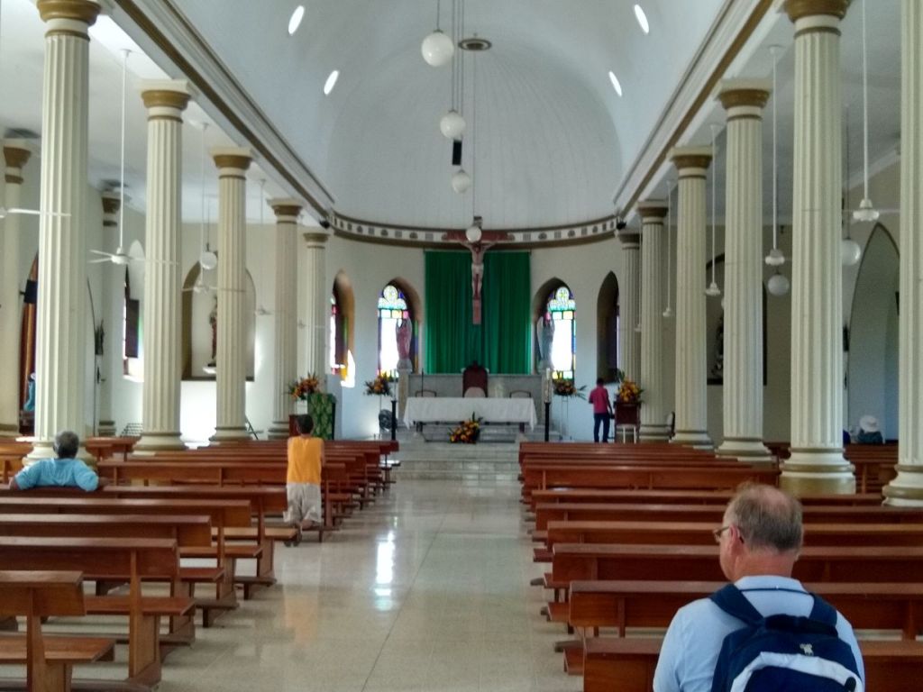 Next up on our tour is the Catedral del Sagrado Corazon de Jesus which is is literally around the corner. it is a beautiful stone cathedral, built from local rock in 1905, replacing an original wooden church (from the mid 1800s) that burned down. Inside there are 3 naves and 2 crosses, plus some gorgeous wood and stained glass windows. From what we’ve read, every material used was local – or at least Costa Rican, and it faces east, to face the “townspeople.”