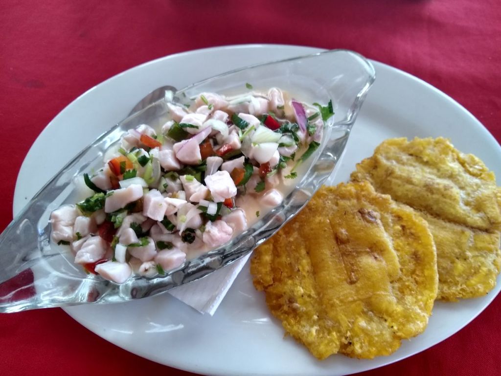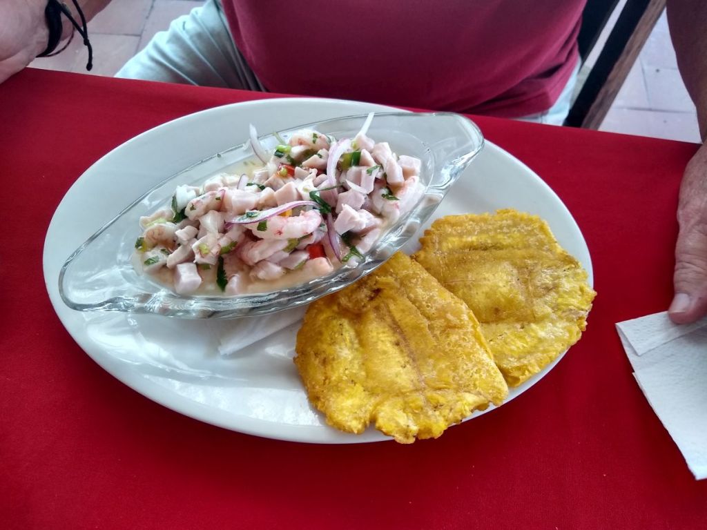 But, they are open. The owner? Waiter? Manager? Some guy, comes out and gives us menus and we settle in for a couple of Imperial beers and to great servings of Cerviche – one mixed and one straight up fish, served with 2 crispy fried pupusas along side. Totally Yummy – and a great atmosphere to boot.