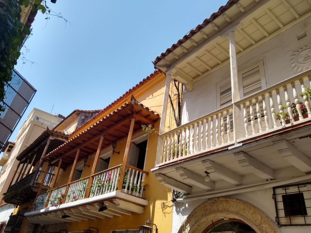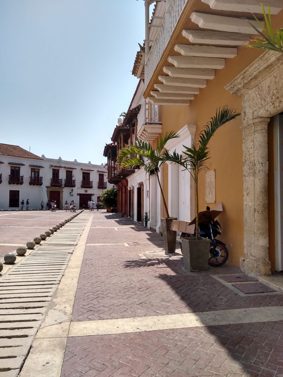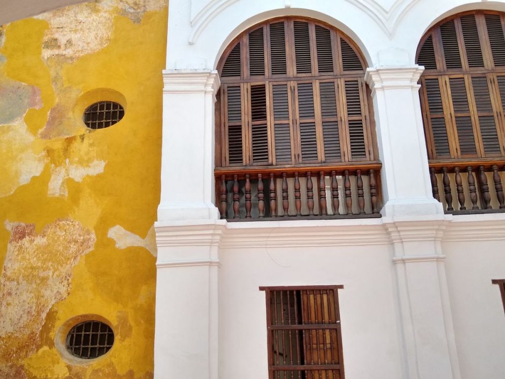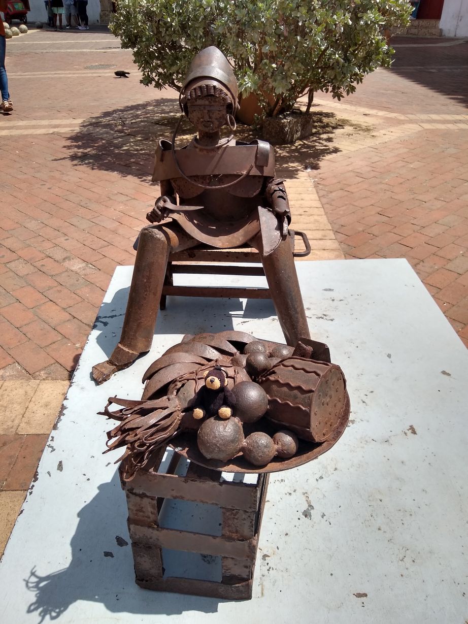 From the gate, we begin our meandering, heading first to the Plaza de la Aduana, a large pie-shaped plaza that is lined with various colonial architectural styles. All colorful, all pretty bright colors, gleaming in the hot almost-noon day sun. There are lovely wooden balconies, lots of flowering plants, some really great ironwork sculptures and a beautiful stone church from the 1500’s, the Iglesia de San Pedro Claver.