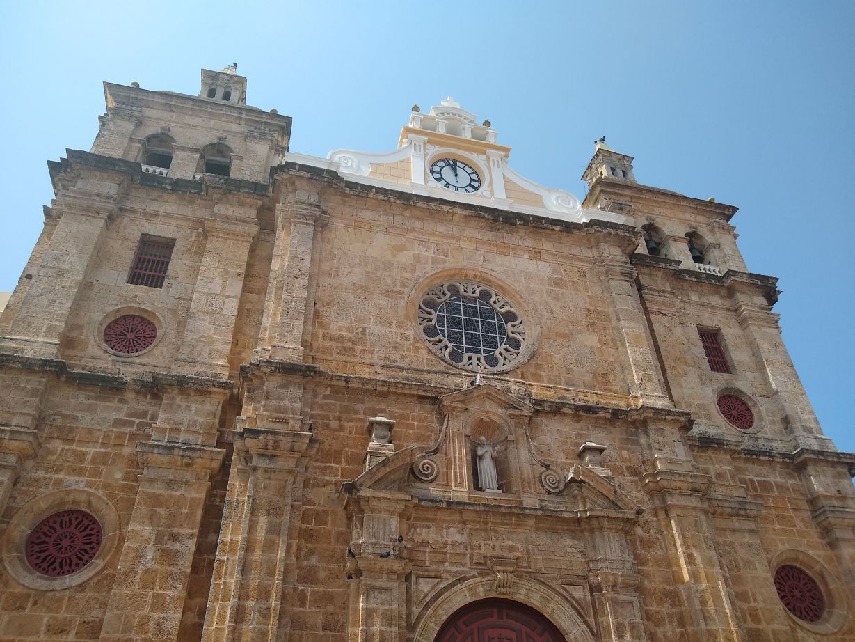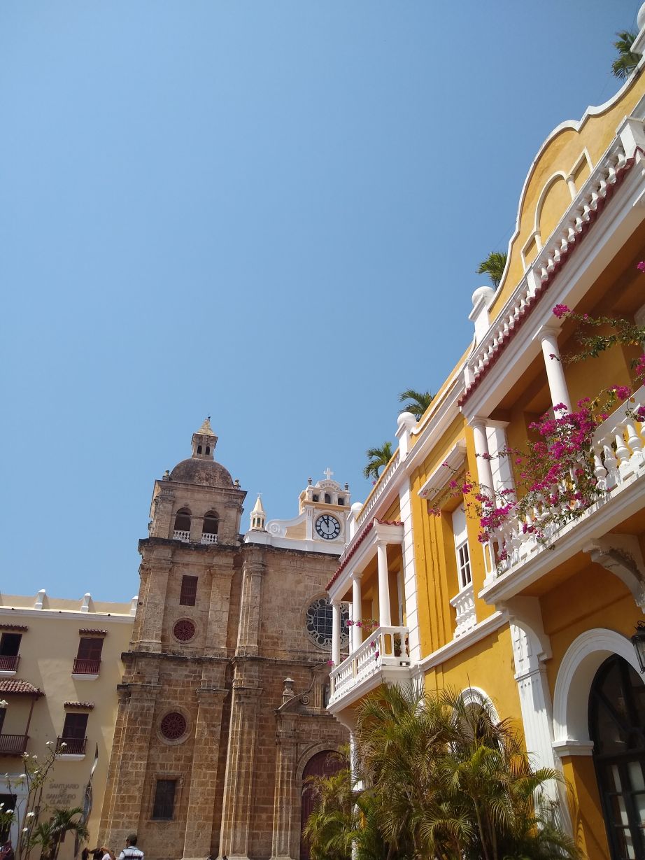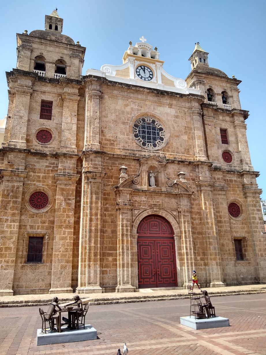 Back out onto the blistering streets we go, hugging buildings to keep in the shade as we walk through the center of Old Town. There are street vendors selling all sorts of souvenirs, but none are overly aggressive as they were the first time we were here (oh so many years ago). Guess that’s what a booming tourist economy will do for tourist dependent vendors. Makes for a much calmer visit, and we are certainly not complaining. Makes it much easier to wander the streets stopping here and there to take pictures of the gorgeous buildings with their vibrant colors and pretty iron and wooden balconies. We make it to Bolivar Plaza, take a picture of his statue, then continue on to the Catedral de Santa Catalina de Alejandria, which isn’t open to visitors currently but is still very picturesque from the outside.