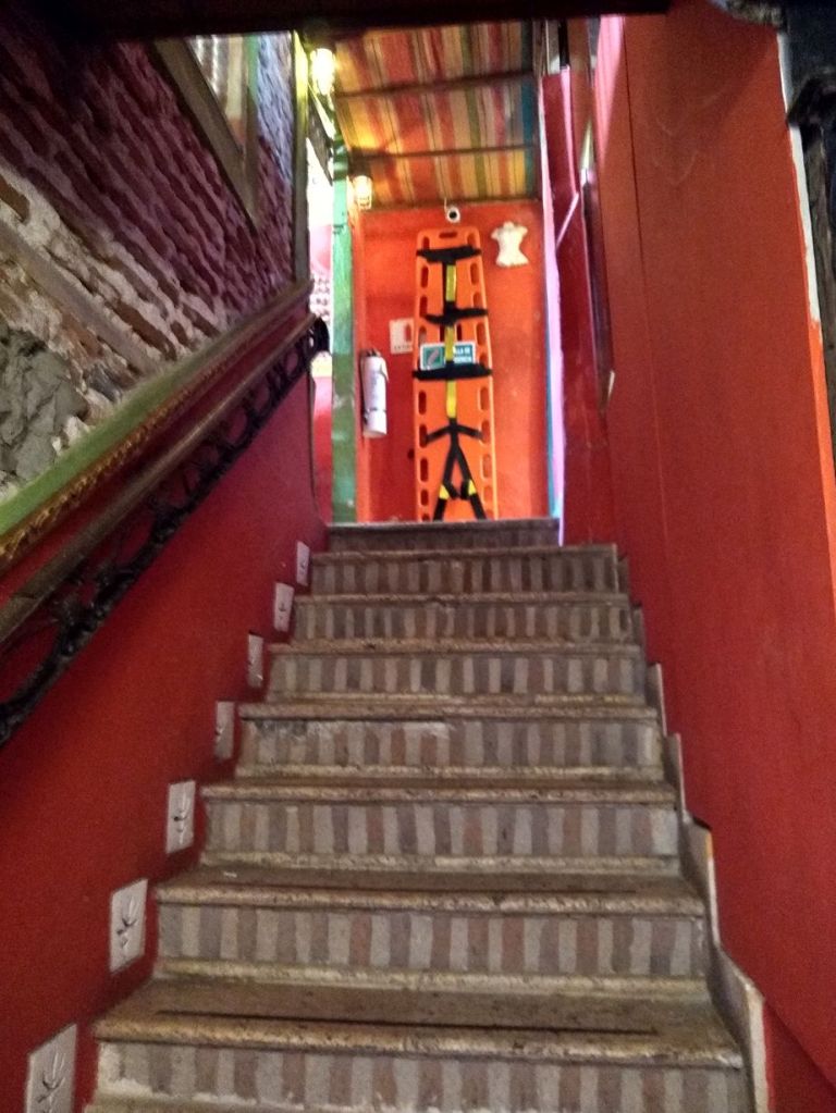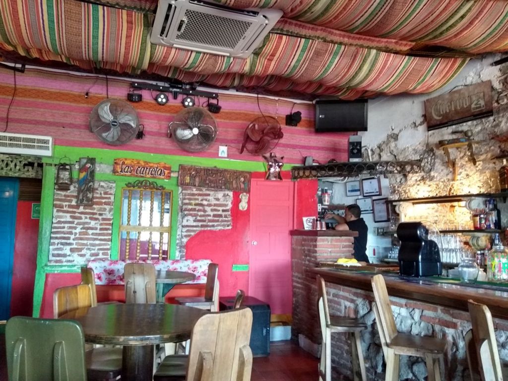 About 20 minutes of wandering around in the heat makes us thirsty. As it is almost noon by now, we begin to look for a place to drink…and eat. The one restaurant I had read about doesn’t seem to be in business, or at least I can’t find it on Google maps, so we go for what’s easily at hand – Cancha Cevicheria (Peruvian, yes, not Colombian, but how can we refuse ceviche?), a few minutes walk from Plaza de la Aduana. Up the very colorful stairs we find an equally colorful, lovely small open air bar/dining area, where we plop down at a high top table, order a couple Club Colombia beers and the large combo cerviche platter and sit back and enjoy. The cerviche platter is excellent, just the right amount and a fantastic mix of fish, with tons of avocado (yum) and…finally…corn nuts! If we can’t find them in the grocery store, at least we can get them in a restaurant. Another beer to share, and we are good to go for our afternoon touring.