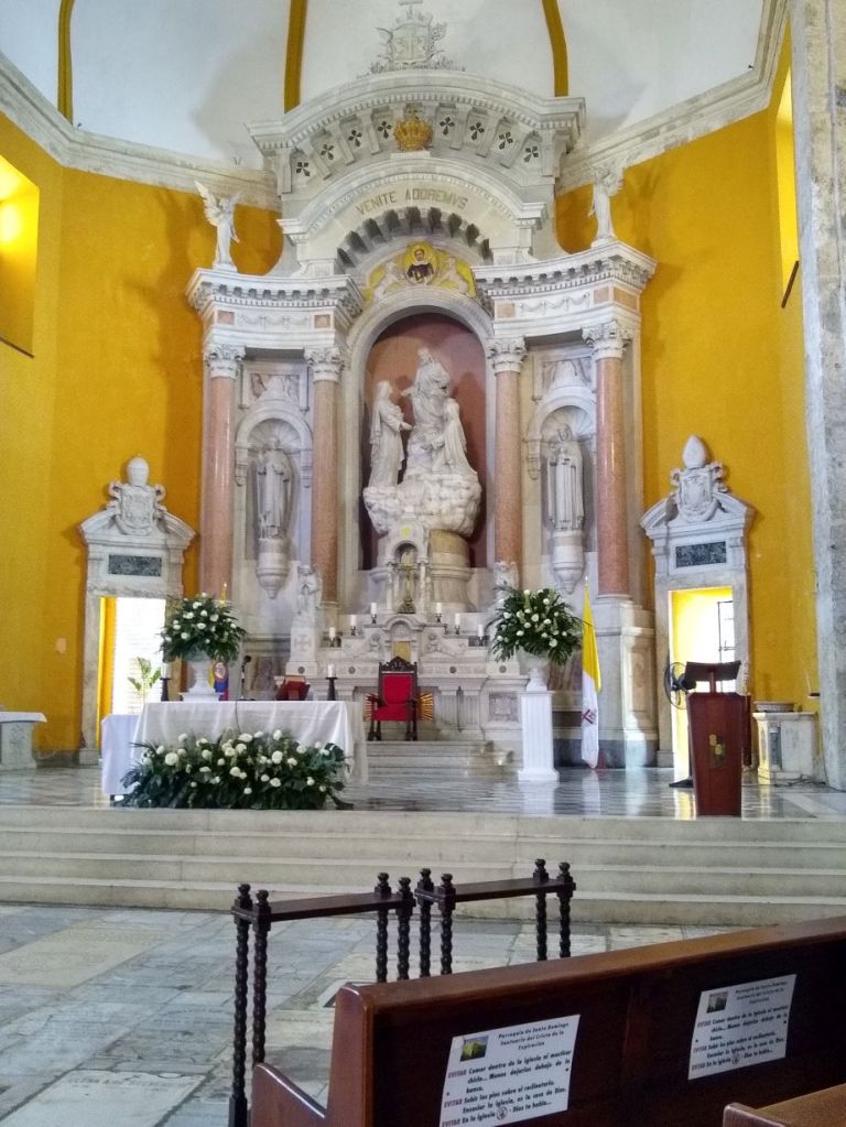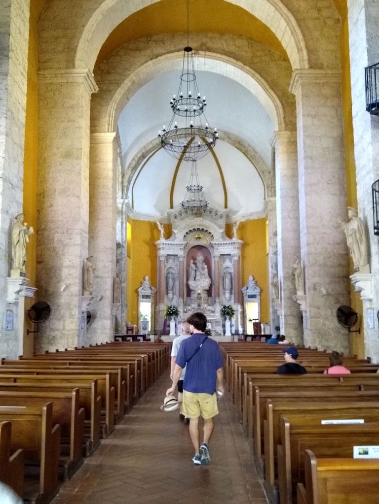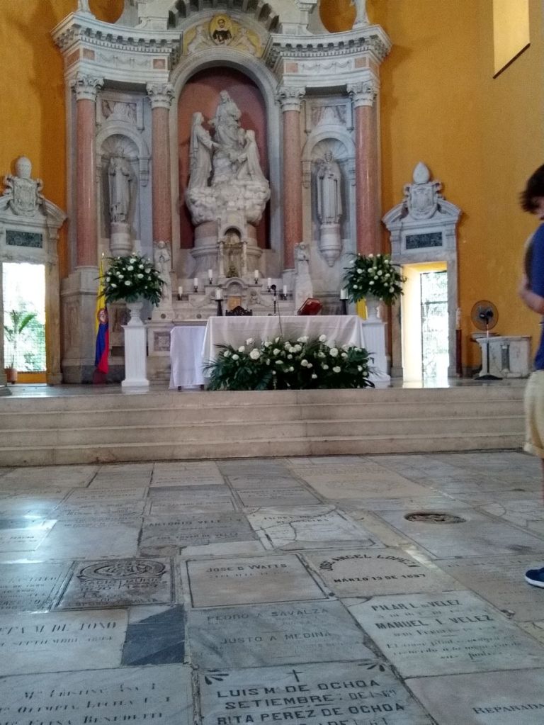 A few blocks away, at Plaza Santo Domingo, we get to burn…oh I mean lay… our hands on Figura Reclinada 92 for good luck. Also known as La Gorda Gertrudis, the oversized statue was sculpted, and subsequently gifted to the city, by Fernando Botero ( a sculptor who is known for his love for all things ‘fat’ and creates all his statues in ‘fat’ form!). It’s cute and fun, and sort of incongruous here in the middle of colonial central America – but hey, what the heck? After getting our good luck, we enter the Catedral de Colombia to take in the beautiful soaring bright yellow walls that dissolve into blinding white arched ceilings and pillars. The altar is flanked by what looks like pink marble columns, with two impressive chapel like altars on each side. One of the most interesting things are the floor tiles up by the nave, each which are engraved as a tombstone sort of remembrance for those who have died. We can’t decide if they are crypts standing perpendicular to each other, or simply markers. Whatever the case, they are fascinating and interesting to see and read.