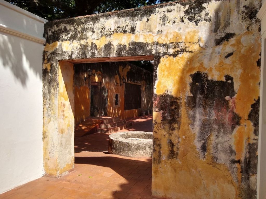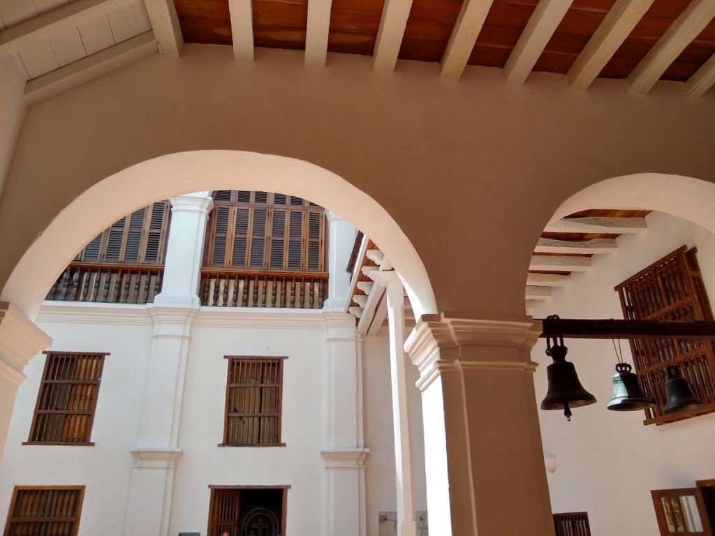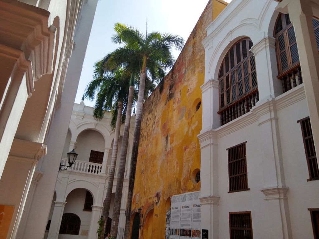 Darn, it’s hot! Too hot to stand up here in the sun with absolutely no shade. (Thus our lack of enthusiasm for walking the walls!) Reversing course, we head back down to sea level and thread our way through the narrow streets to the Museo Historico de Cartagena, which turns out to be not so much an overall historical perspective on Cartagena, but a museum of the Inquisition. These buildings are where the Holy Court was located in the 1700s (after being established in 1610 as the 3rd such court in all of America, following Peru and Mexico) and was called the Palace of Inquisition. We had no idea! And what a fascinating place – horrifically fascinating, but fascinating nonetheless. First of all the architecture is totally picturesque – a beautiful central patio encircled by blindingly white two story buildings (and one art deco-ish yellow wall) with wooden windows, balconies and open air stair rails.