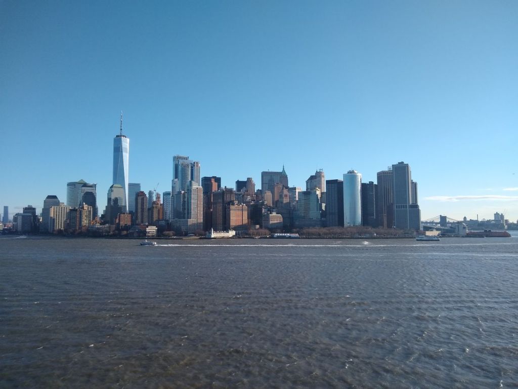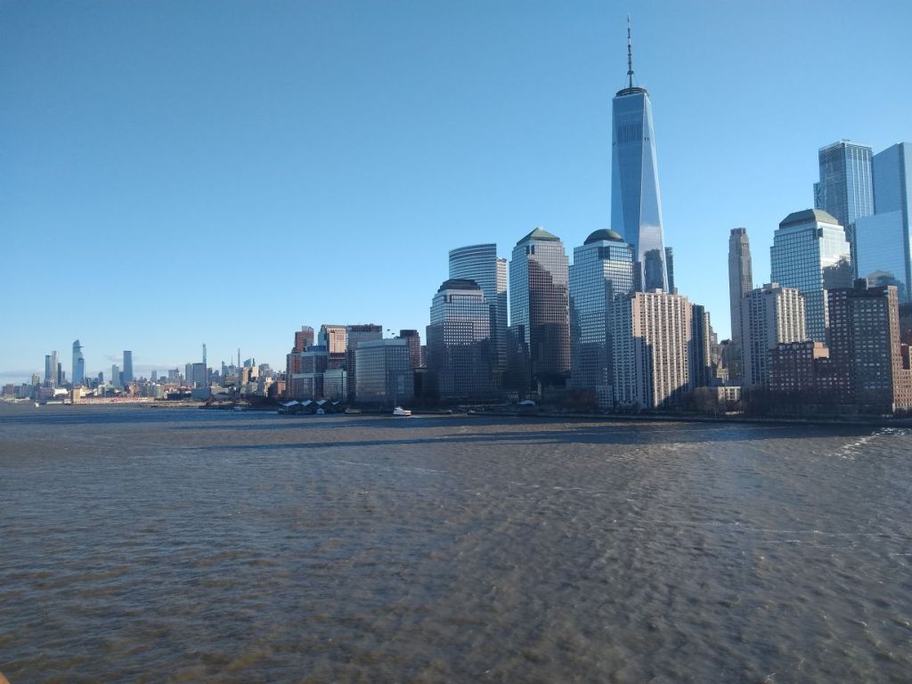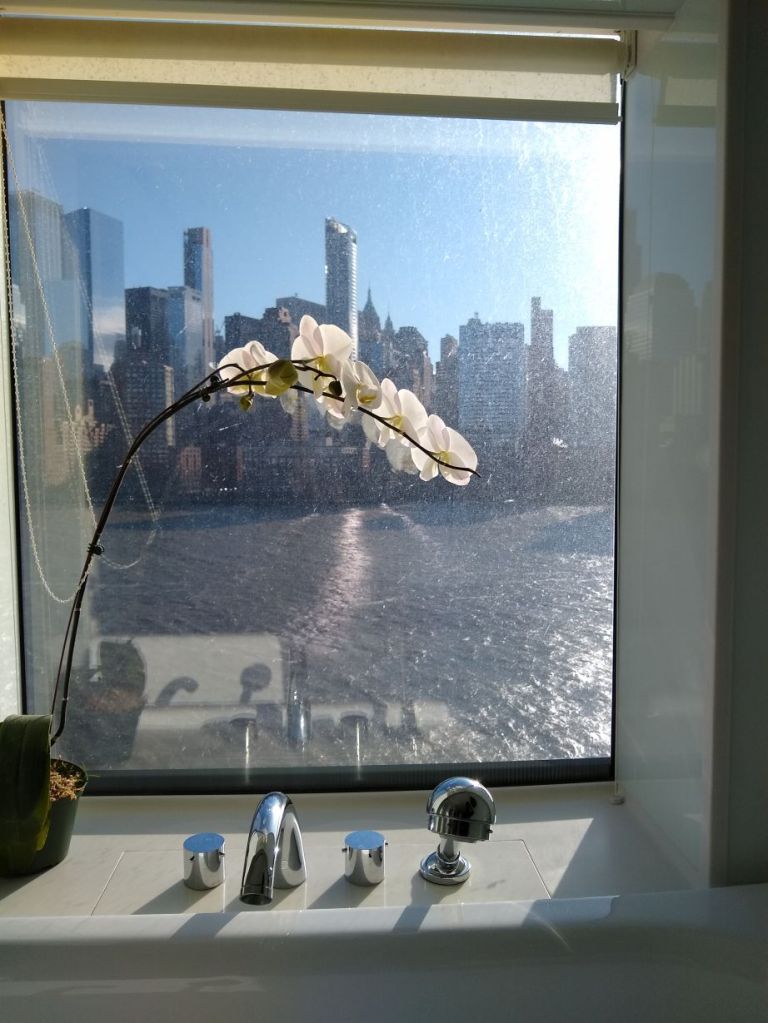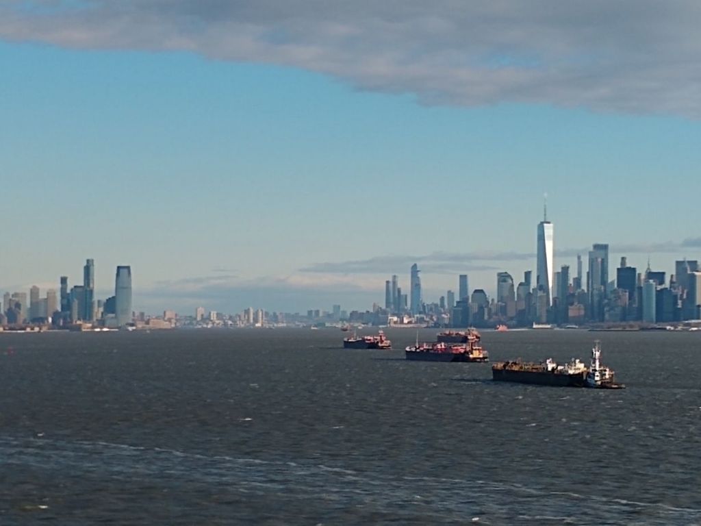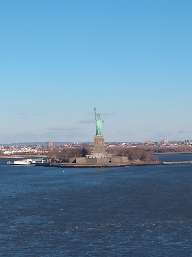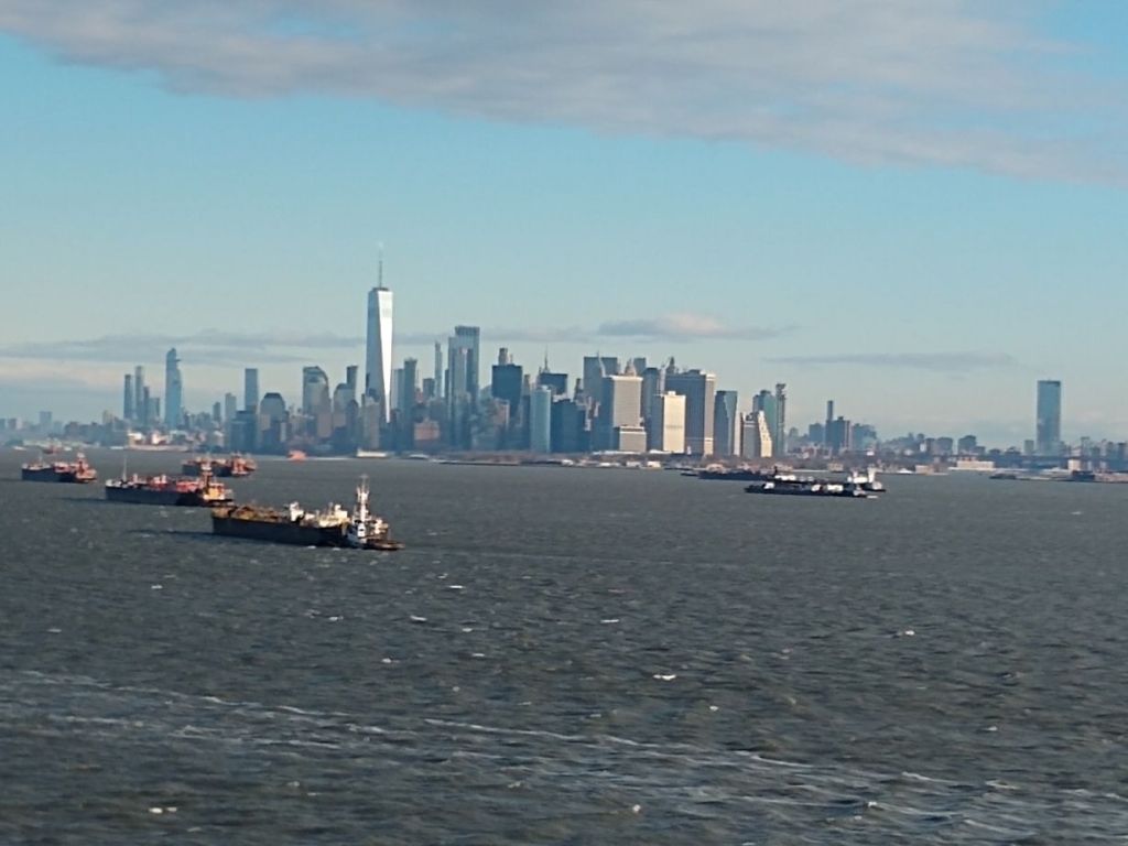 Happy Valentines Day! And happy 36 hour travel day! The day begins on a bit of a downer – we thought we were getting into NYC at 6 or 7am and have a day-room at the Hilton Garden Inn booked so we can spend the day there in comfort before heading to JFK for our 6pm flight. But the captain has been saying 10am arrival for days now, even as our disembarkation info says 8:30 for walk offs and Gian tells us it should be 8:30 or 8:45 when we begin. As it turns out, the captain was correct – there was a huge storm and strong winds off the coast last night which slowed us down and we do indeed dock at 10am. The negative is that we’ll not get maximum use of that day-room, but the positive is that we get great shots of the Statue of Liberty and the NYC skyline (yeah, including the artsy ones taken through the window above the tub in the bathroom!).
