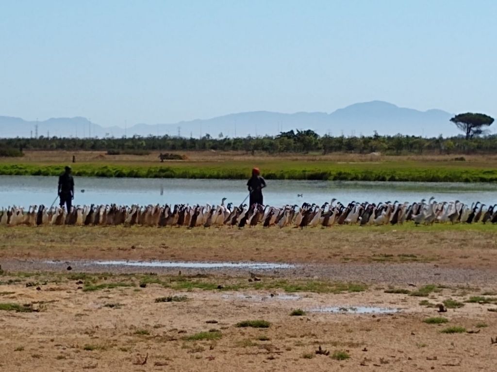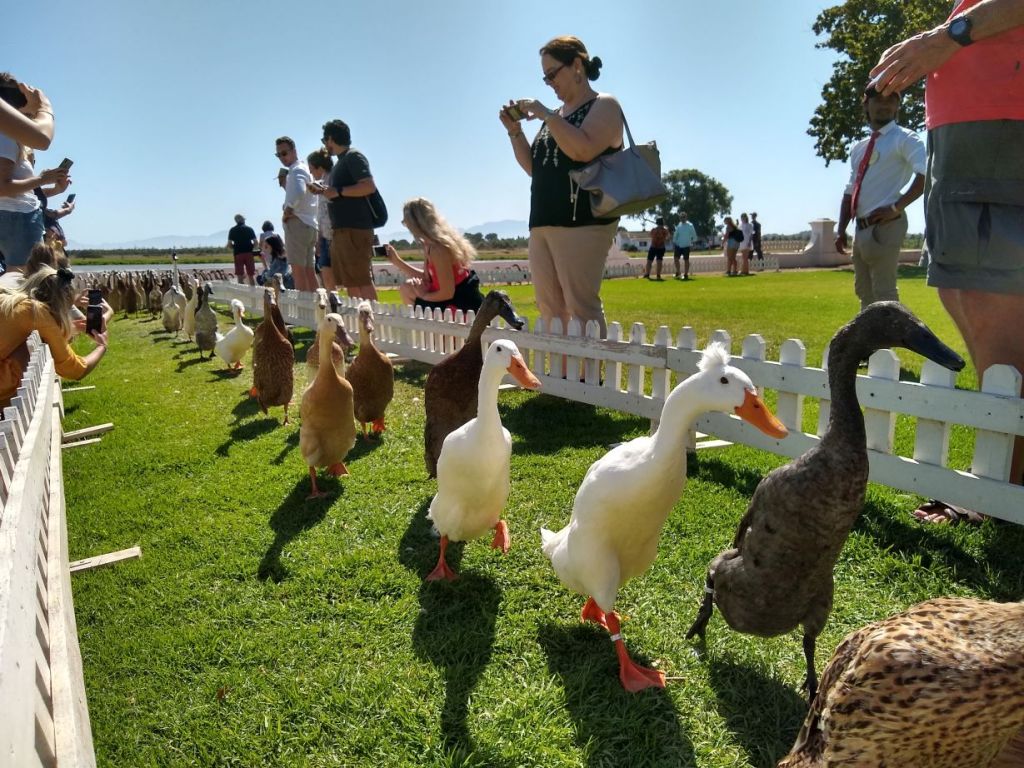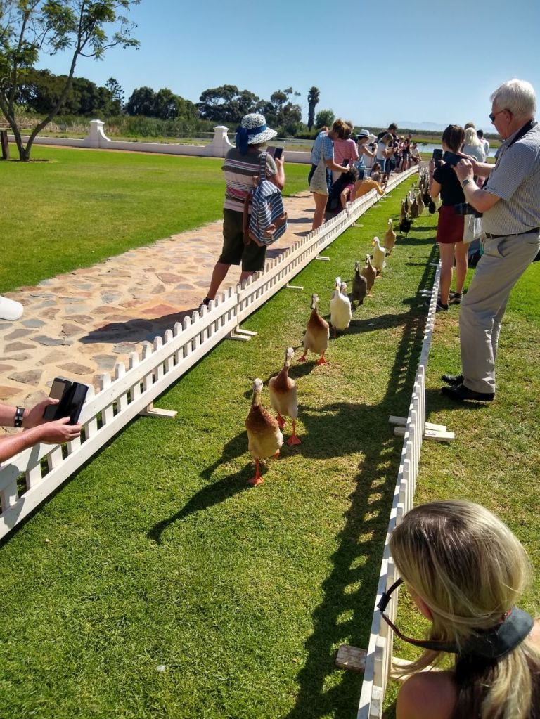 We make friends with Nona, another wine tour passenger who is actually on the cruise with us tomorrow, and spend our remaining time chatting with her in the pub. There is also another couple on the tour who are currently on the ship but disembarking tomorrow, so we all chat together once we are back on the bus and heading toward our final destination, the Vergenoegd Low winery that uses ducks to keep their vineyard free of insects. Every afternoon, they have the running of the ducks, where they basically train the ducks to run straight through the rows of vines by funneling them through a little picket lined runway from their pond (of course to the tourists’ delight). Our visit is schedule to coincide with the running and it is very fun to watch these guys get shooed from the pond down the runway chute.