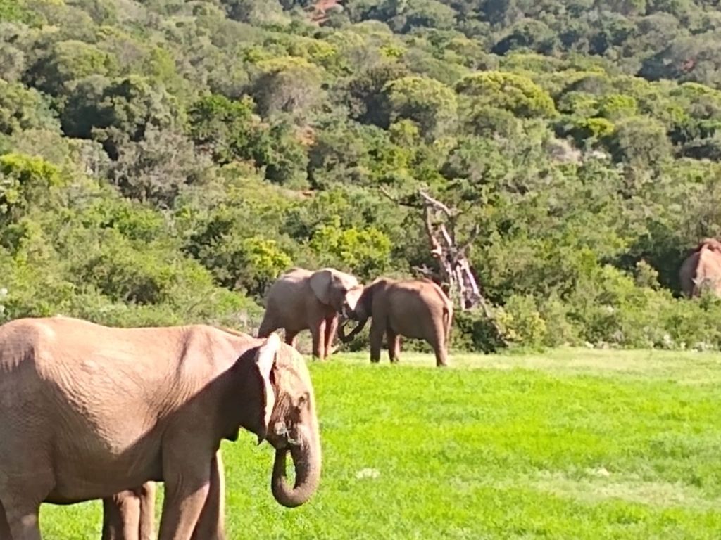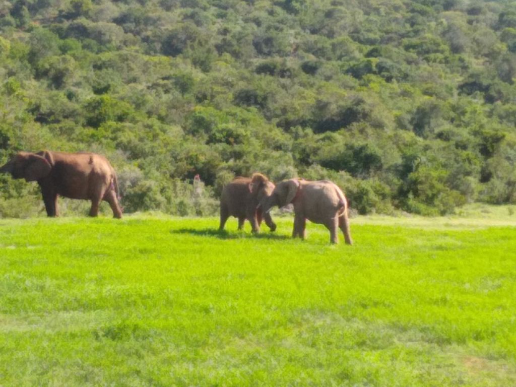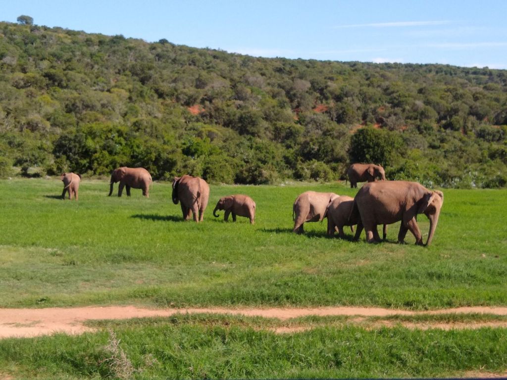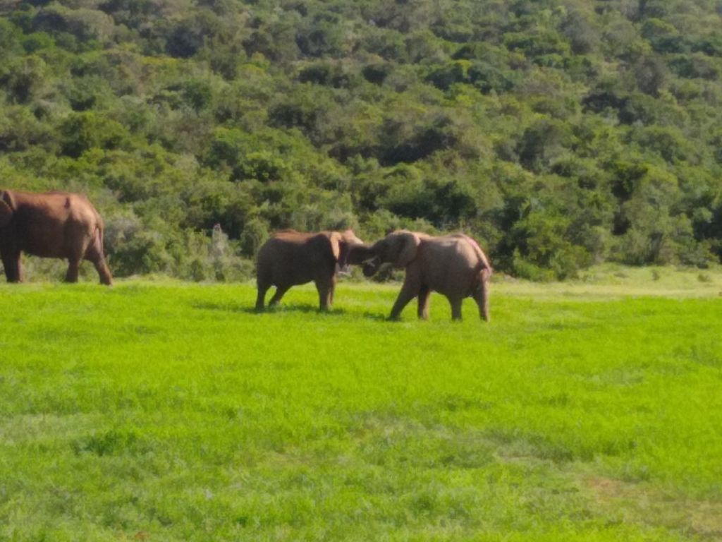 Graeme and the driver compare notes on the route we should take (they’ve been having this little passive-aggressive tussle all day long which was actually sort of humorous to watch), finally deciding on a course of action to get us back through a different route than the one on which we arrived. The great thing is we’ve still got hours of wandering through the park roads in search of wildlife on our way back, which we find immediately in the form of Kudu bucks. Then it is back to the elephant-palooza! We find a huge herd grazing in the fields, with a whole bunch of babies and youths, including one set of young bulls tussling around in the background. They are so fun to watch, butting heads and pushing back and forth against each other with their tusk entangled. We spend a good 5 or 10 minutes there just watching their antics.