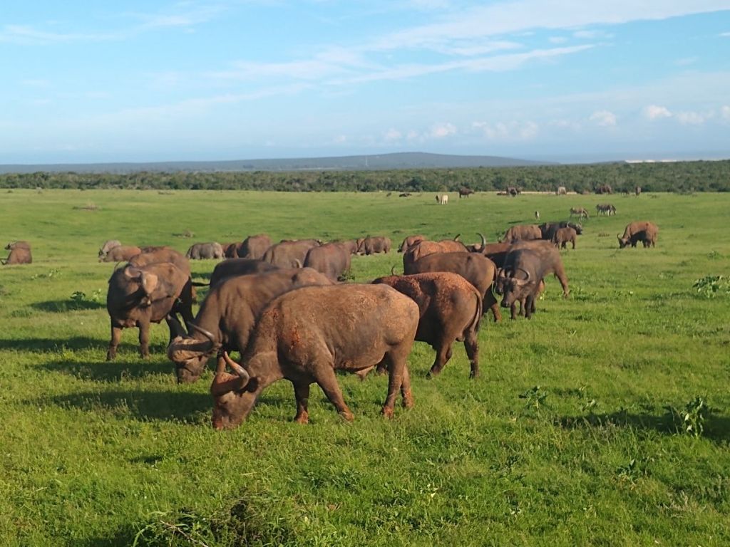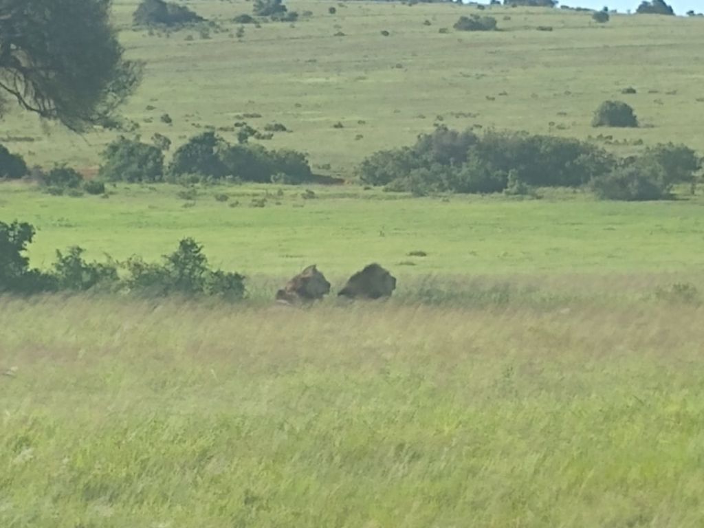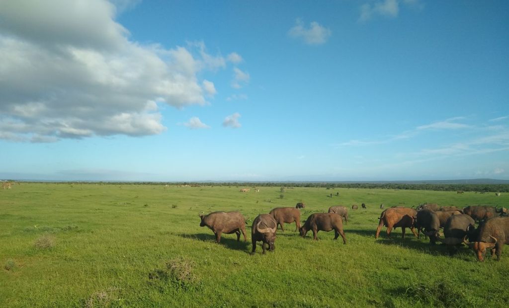 As some of the other vehicles begin to leave, we inch up so that we are almost parallel with the tree and lion, when all of a sudden we see two sets of paws. There are two!! Now comes the waiting game. We sit quietly looking at the space underneath the tree, willing the lions to move or sit up so we can see them. Nothing but the wind rippling through the tall grass, which in and of itself was pretty cool and very much what you’d think Africa would look like, but not as cool as seeing lions. Minutes go by. Nothing. Graeme says we must be patient, so we wait. Finally, 3 cape buffalo appear down wind of the lions. They meander about grazing, and we can’t figure out why they haven’t smelled the lions, when suddenly the big one stops and stares right at the tree. Then another on stops and stares.