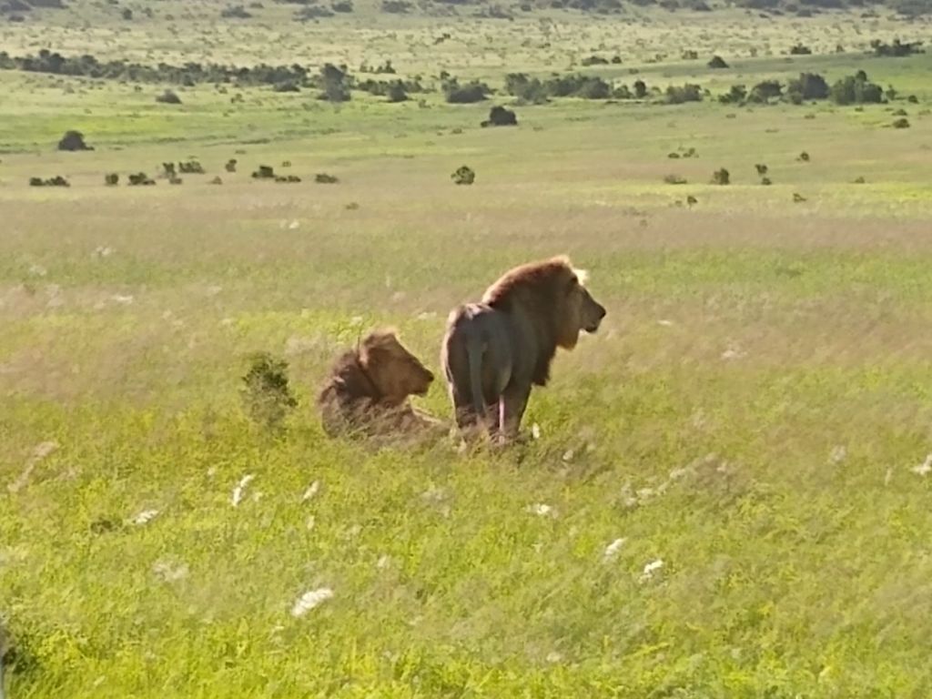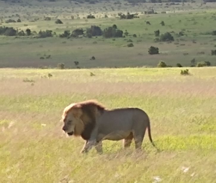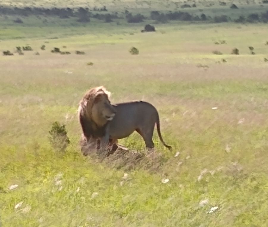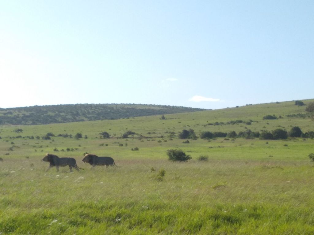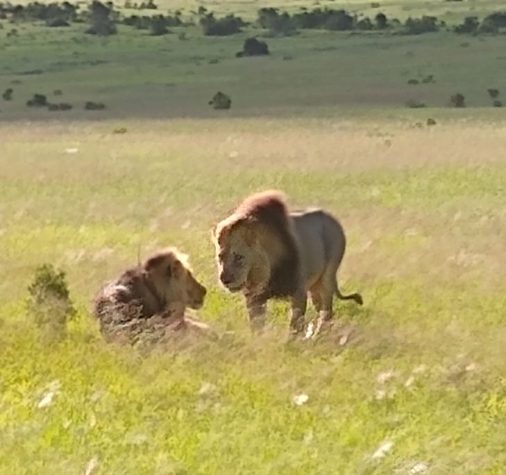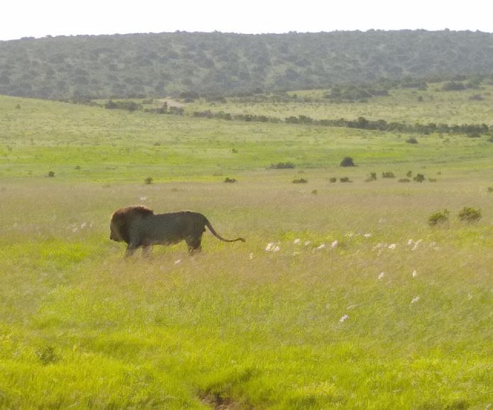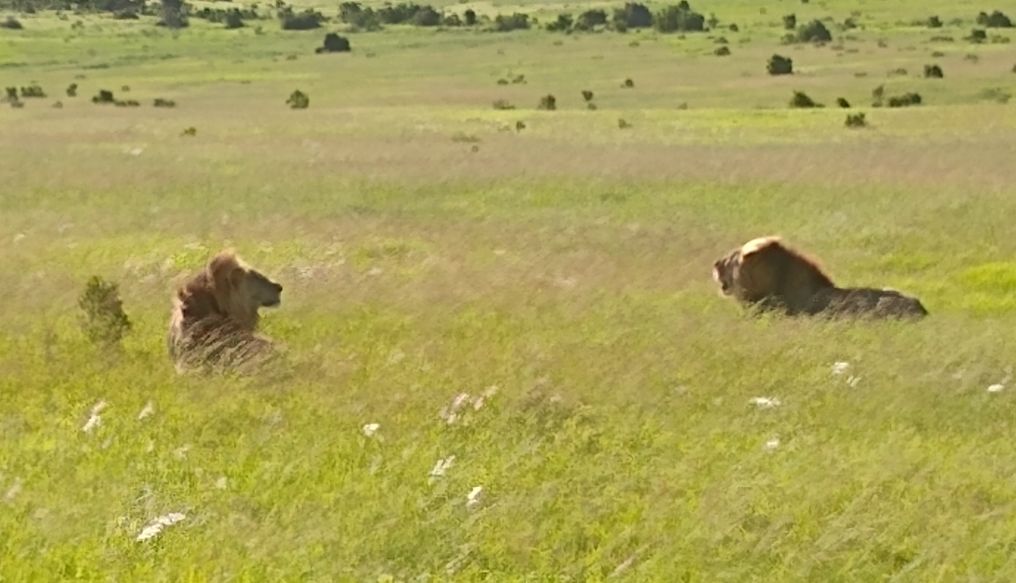 We’re waiting to see who is the king of the savannah here – are the lions hungry enough to attack? Or will they not bother and go back to sleep? Well, apparently they aren’t hungry, but they also don’t like the buffalo so close because they get up and move away from the tree and the buffalo, glancing back occasionally to make sure they aren’t being followed. Awesome! Prime picture taking opportunity as the two male lions saunter across the field, then plop down a little ways away from the van in shorter grass. We spend a few more minutes marveling at these two lion kings, then slowly turn around and head back toward the south entrance.