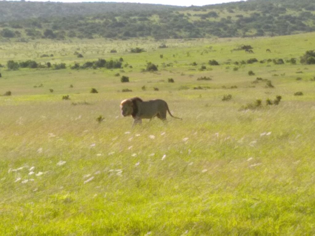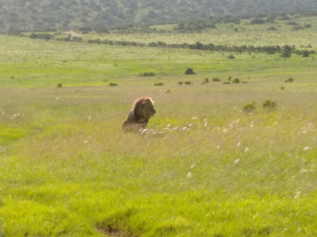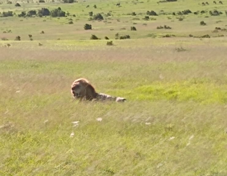 Meanwhile, Graeme has been checking his whatsapp Ranger group for lion sightings when we had service at the lodge. He says that a lion was sighted in a specific area and we speed off to see if we can spot him. As we approach this huge wide field, there a ton of cars sitting on the side of the road, indicating a lion is somewhere. We pull up and stare at the tall grass, seeing nothing. But Graeme and the driver see the lion lying under a tree in the shade. How they can spot these things, I’ll never know! I guess training and practice and from doing it for so long, but honestly, all we see is a tree out in the distance with some tall grass around it! And then it stretches! OMG there is a lion out there! We see it’s paws come up out of the grass in a stretch and then his tail switches. Cool.