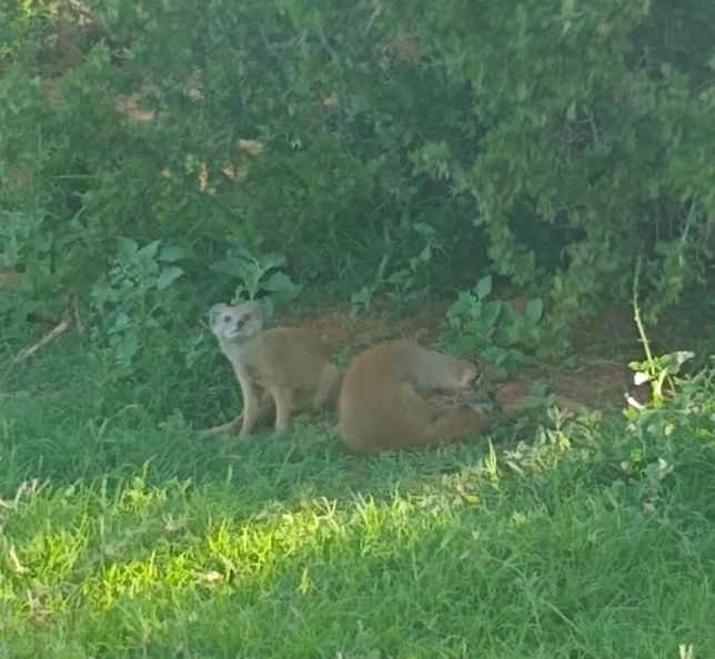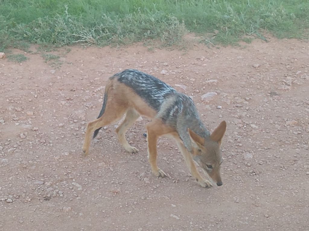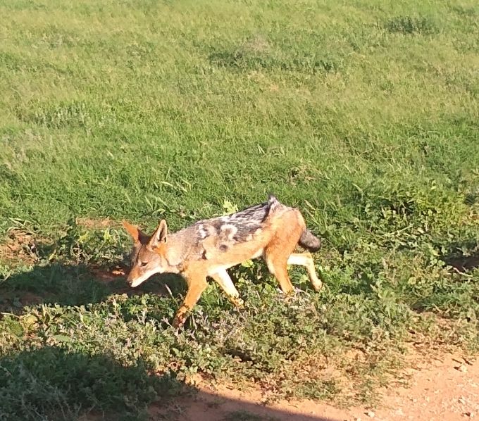 Along the drive we encounter a pack of yellow mongoose, who are really quite cute looking little fellows (like a weasel or ferret), and are quite curious about us as they poke in and out of their little den underneath a thorny bush. Then we find a couple of black backed jackals who are eating something off the road – insects or some little microscopic specks that we can’t really see. One just wanders all along the side of the van as he eats, his long hair on his back rippling in the wind. We might as well not even have been there for all he cared.