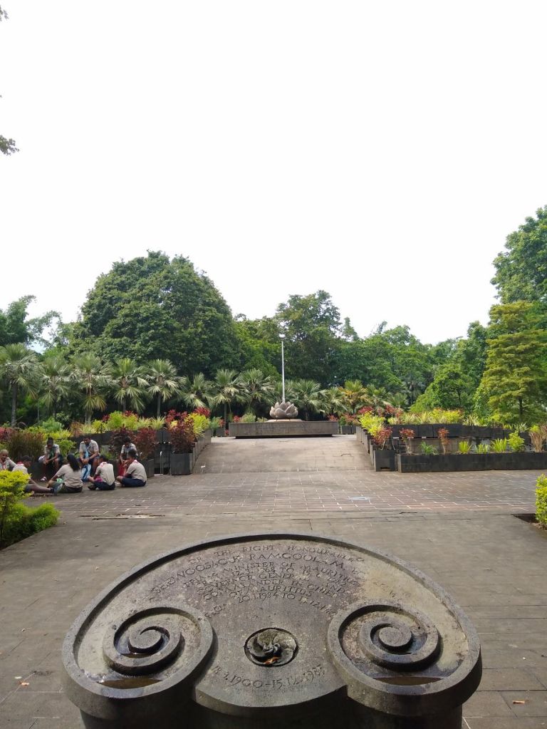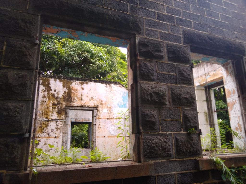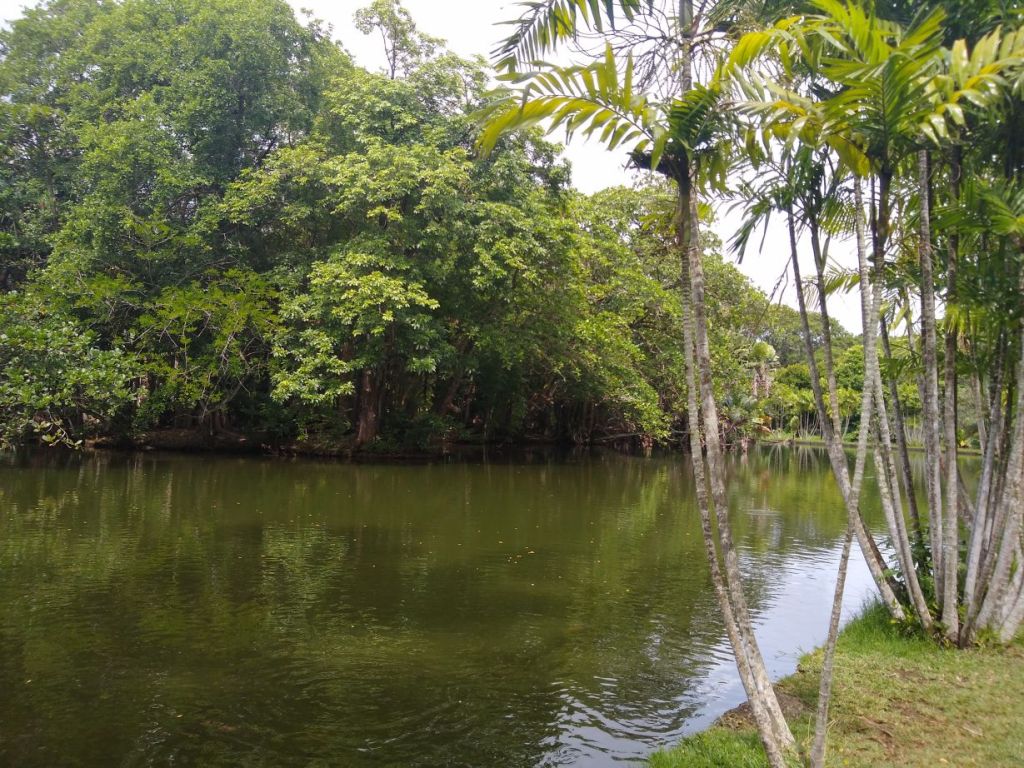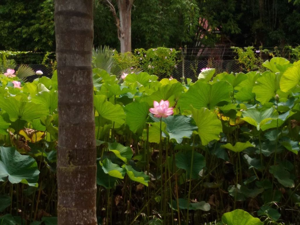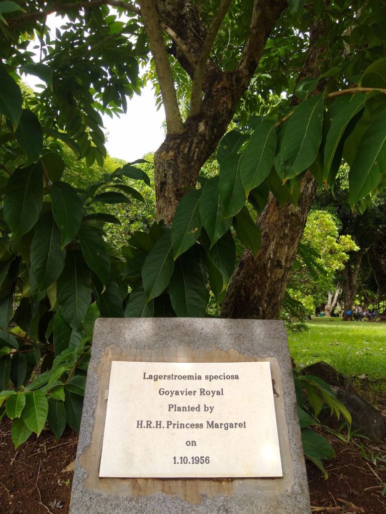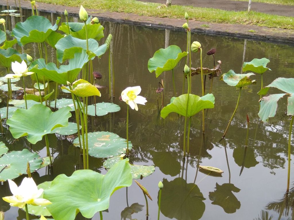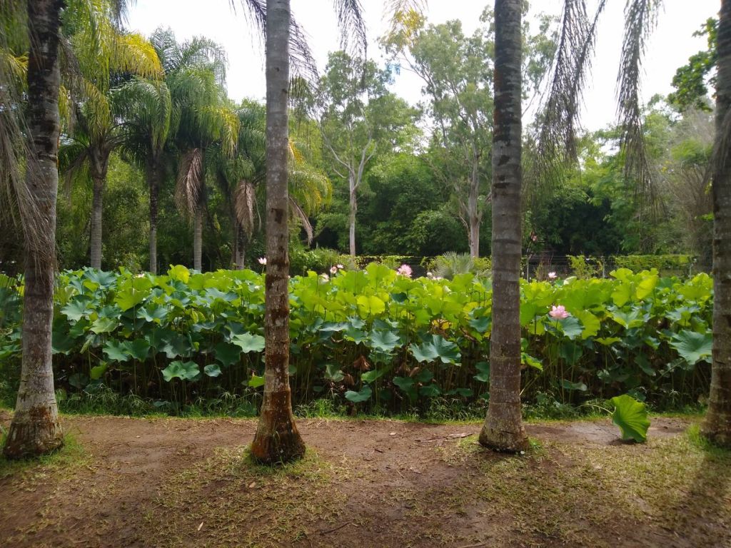Oh well, we pay our entrance fee and then start wandering down the lovely tree lined paths, in the opposite direction of the tour. It is quite beautiful, but it is also quite hot and humid with rain threatening skies (oh, btw, Seeva has provided us with a big umbrella to use, even though I told him I have one – he said it was too small and we needed the big one – nice touch!). We are melting within minutes, but we can’t go back yet, so we continue our explorations wandering past some old abandoned ruins and a monument of some sort. We make our way to the Giant Nenuphars – these totally cool giant serving tray like lily pads, then sweat our way over to the white Lotus pond before ending up all the way at the end of the garden by the Chateau de Mon Plaisir, built in 1823 which now holds a photographic exhibition in honor of Ramgoolam – whose grave is also located right outside the building. There is also a really nice memorial to Ramgoolam across from his grave, with a beautiful lotus flower sculpture surrounded by vibrantly colored plants and palm trees.