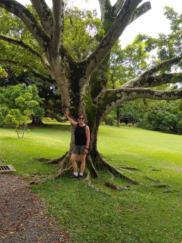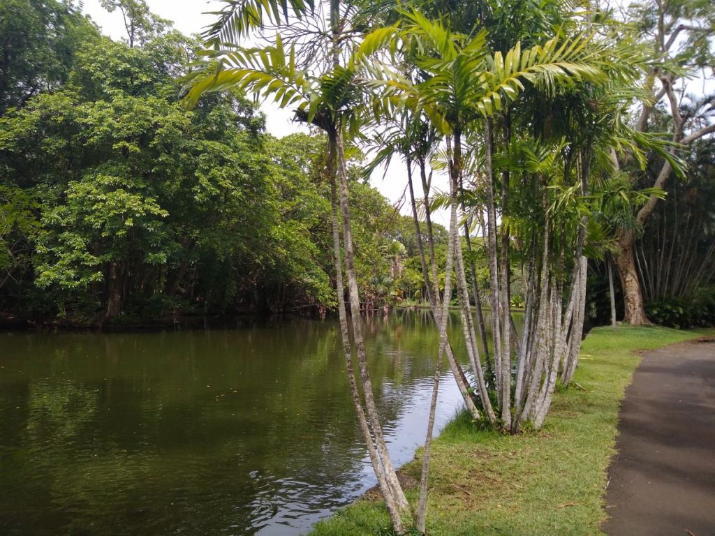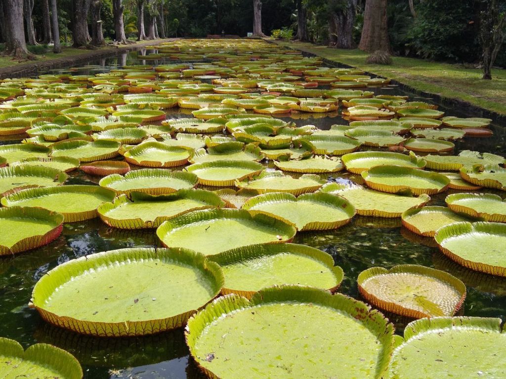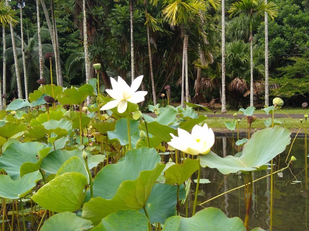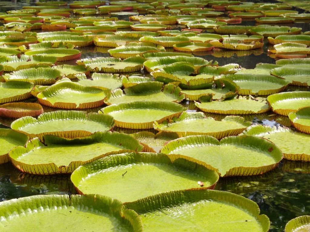 Our next stop is the Pamplemousses Botanical Garden, created in 1767 by Pierre Poivre, who I believe was a French naturalist and the superintendent of the both Mauritius (Ile de France) and Reunion (Ile de Bourbon) at the time and in honor of Seewoosagur Ramgoolam, considered the Father of the Nation. The gardens cover 37.5 hectares and have thousands of plants and lots of water features that are home to fish and gorgeous water lilies. Seeva shows us the exit gate where he will be waiting, and drives us over to the main entrance where, sigh, one of our tour buses is just letting off. Pooh.