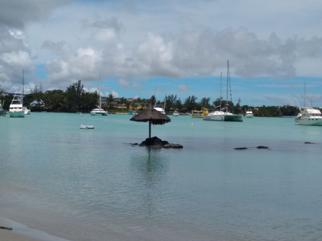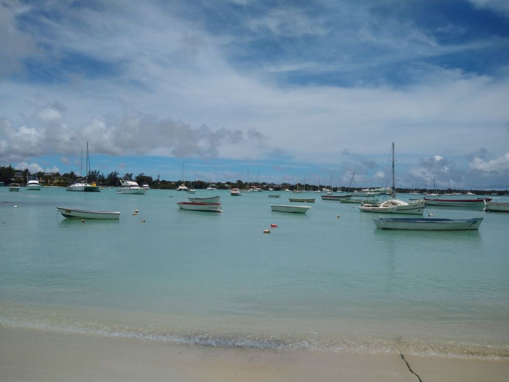 Driving around Grand Baie, there are lounges and bars and discos everywhere. Seeva tells us this is the active part of the island and that at night it is very busy with people essentially partying. We can see definitely see that here! And even in the day time, it is much busier here, and sort of crowded with buildings edging close to the street. A very different feel than from Port Louis. We stop next at Pereybere beach, which is more low key than Mont Choisy, not as crowded with water that is more “bay-like” including boats moored in the water just off the beach. The water is gorgeous and the clouds, so puffy, stand out like bas relief art in the distance.