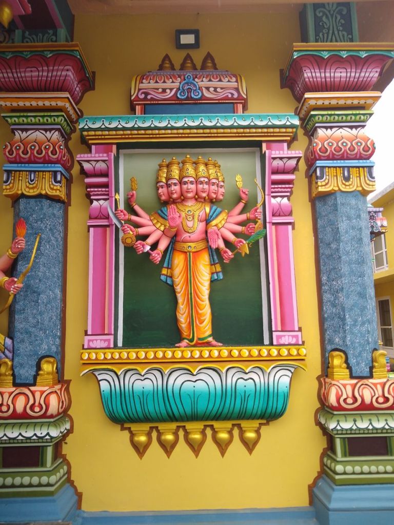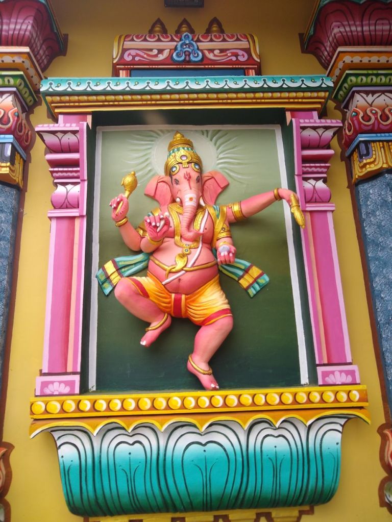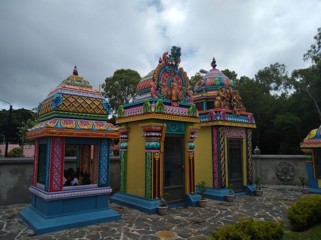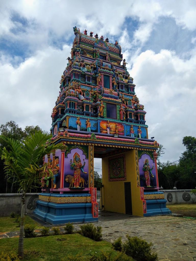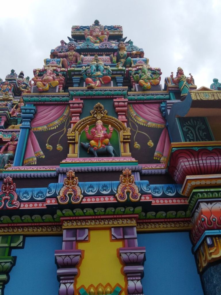 Earlier, when we were chatting, we told Seeva about our Reunion Island experience (Actually it was then that we searched on Reunion island and found that the protestors were violent today when the Sun Princess arrived, throwing bottles and rocks, and setting trash bins on fire. The police had to use tear gas to stop it and arrest everyone. There is one picture we found, where I swear it is the same guy who was blocking us yesterday!) but also about the Hindu temple we visited. Well, Seeva is not going to let us get away with just visiting a temple in Reunion – he detours out a little way and takes us to his temple – Sri Draubadi Ammen Temple – for a visit! And what a temple – it is virtually new and absolutely gorgeous in all its colorful glory. Blues, purples, yellows – all help vibrantly depict the important deities all through the complex. We’re particularly taken with the Ganesh tower, where there is a brightly painted Ganesh atop an elephant head with a huge trunk extended out from the pillar. We’ve never seen anything like that – its excellent.