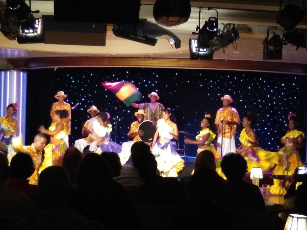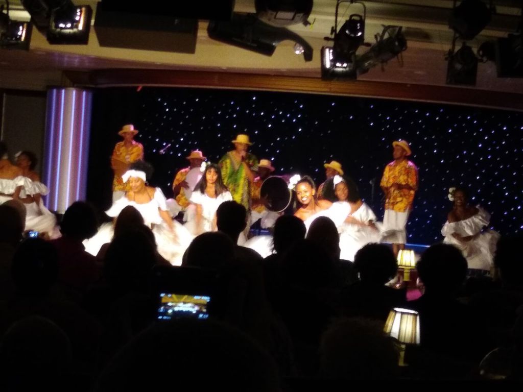 Back aboard, we eat a late lunch, hang out, play trivia, hit the gym then go to the local Mauritian dancing show which is a fabulous 30 minutes of traditional Sega dancing with 7 women in bright white dancing dresses, 5 men on those cool round see through drums and one male singer. The dancing and the music are wonderful and entertaining and we love every minute of it! Especially the youngest dancer who is at the back, with long straight black hair and won’t smile to save her soul. You can just hear her thinking “why in the world am I here dancing for these tourists!” She’s beautiful and dances well, be its almost hard not to crack up watching her facial expressions. Bless her heart!