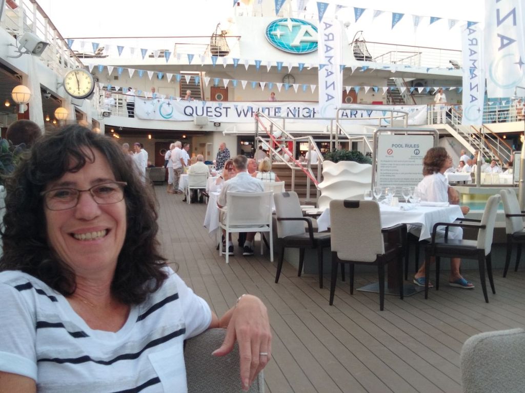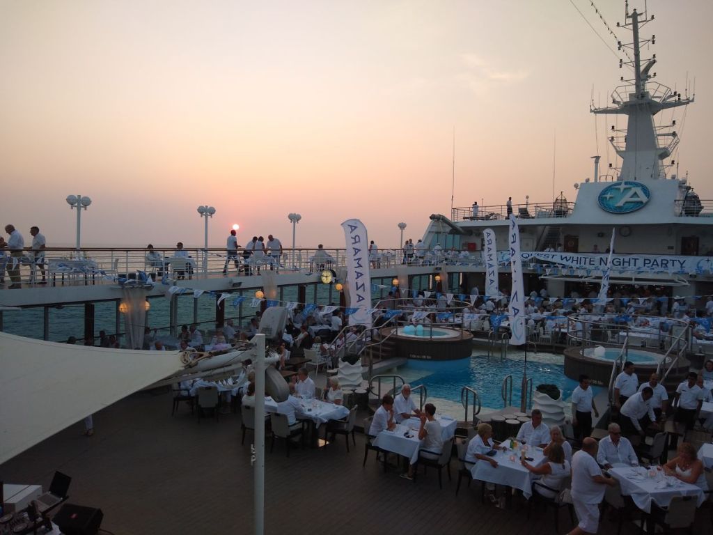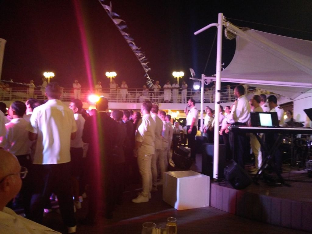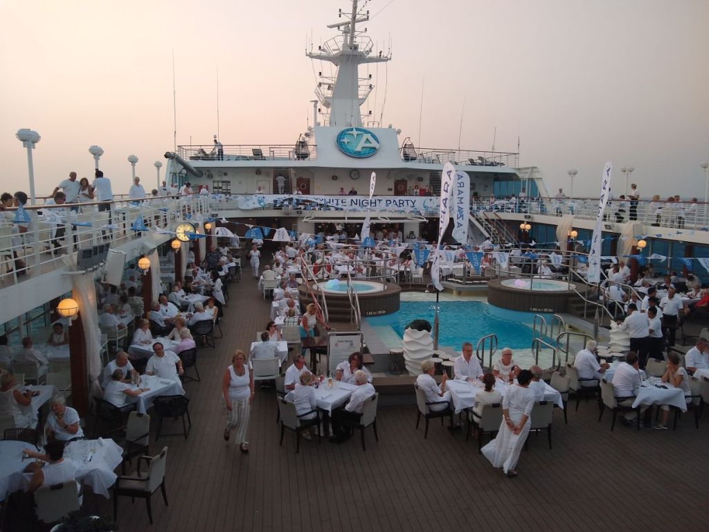At least we had White Night that night, which was so amazingly good and so much fun. We snagged a table right off the stage, sort of tucked into the curving stairs to the upper balcony, which put us out of the wind and in perfect position for both the buffet and the festivities after dinner. It was a perfect way to release some of the tensions all this crazy Coronavirus thing is causing us, even though, let’s be honest, we are safe and secure and healthy and happy aboard our little bubble of a ship. So, really, this night is also a celebration of that as well.