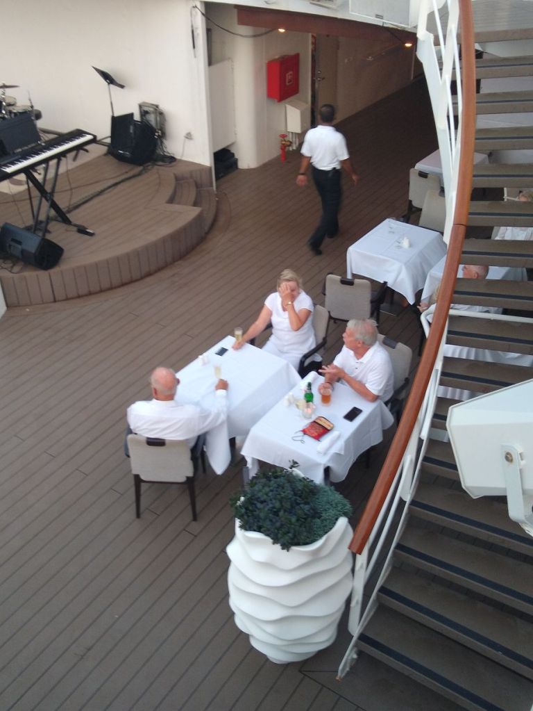 We actually end up spending the entire night up on deck, eating fabulous food, chatting with a couple who sat down next to us, with Chai, our wonderful waiter from the Patio, serving us beer and wine the entire time – he was adorable, when he couldn’t get to me because of the dancers, I just held out my wine glass under the stairs, and he reached over with the bottle and filled it up. Later he said, “I’ve never poured wine that way before!” Obviously a big deal – I’ll be in his memory forever….remember when I poured wine for that lady under the staircase…. 😊