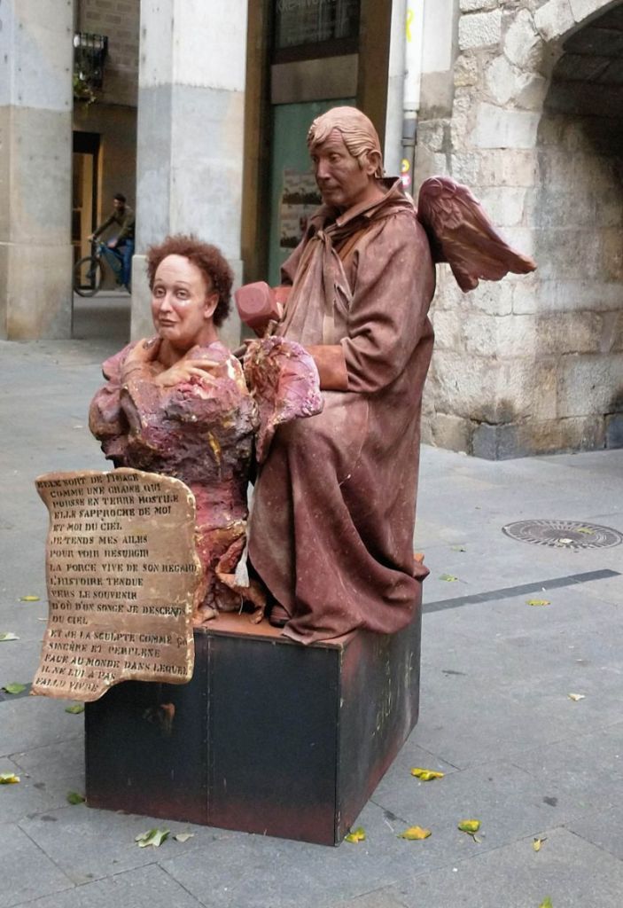 But for now, we are just orienting ourselves. First we hit the grocery store located about 3 blocks from us for supplies. Beer, wine, lunches – including the ever favorite esparragus blanco – oh how we love Spanish white asparagus! You can’t find it anywhere in the states, well at least not reasonably priced, and we gorge ourselves on it whenever we are here. Then we strike off into town, finding the main pedestrian street easily enough – it’s literally a block from our apartment. Wandering through the 95% masked crowds (sigh, what a refreshing sight!), we find vendors (one of which has Spanish Limoncello – what? And it’s really good – so, yes, we buy a bottle, probably shouldn’t have, but it was really, really, good – and to be honest? Better than the Italian version, so…. We have an aperitif now!) and human statues – these guys were the best we’ve ever seen! As well as displays for the annual event and just lots and lots of activity.
