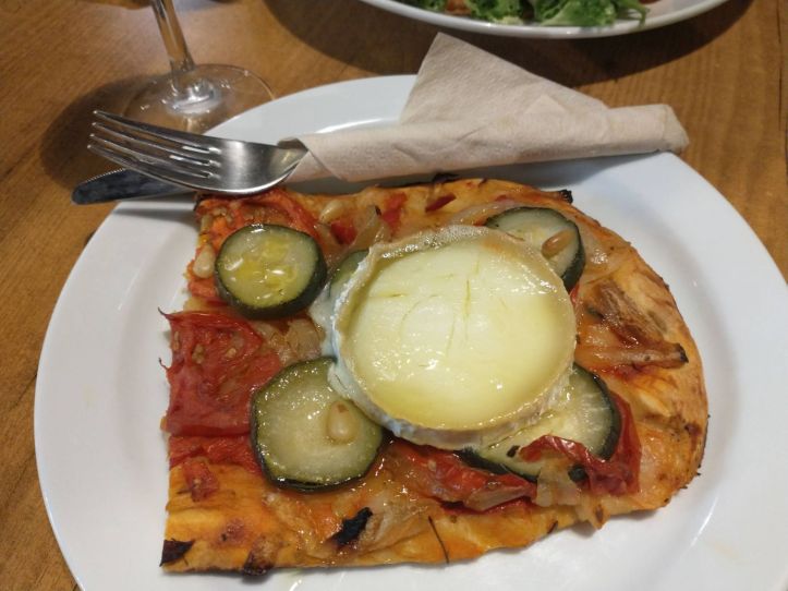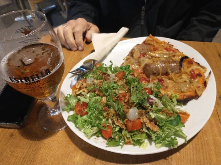 Soon it is time for dinner – although not in Spanish time – but in our time! We actually chose a little restaurant a block away from us because they are open until 8:30 and serve continuously – as opposed to a lot of the other establishments that close at 4 and then don’t reopen again until 8 or 8:30. That’s just too late for us, particularly today of all days when we’ve been flying overnight. Thus, it is El Pessic for us – and it is a winner. The waiter is adorable, and the food….well, the food! I had eyed this bread – sort of like flat bread – with warm goat cheese and zucchini on it – and I couldn’t resist. Ed has the same bread, but with butifarra sausage on it, plus, he’s good and has a salad, which of course I take nibbles of too. Excellent! As it turns out, these breads are typically Andalusian – called Coca de Recapte – and served everywhere here. We’ll end up seeing them every day, in every town and restaurant we pass.