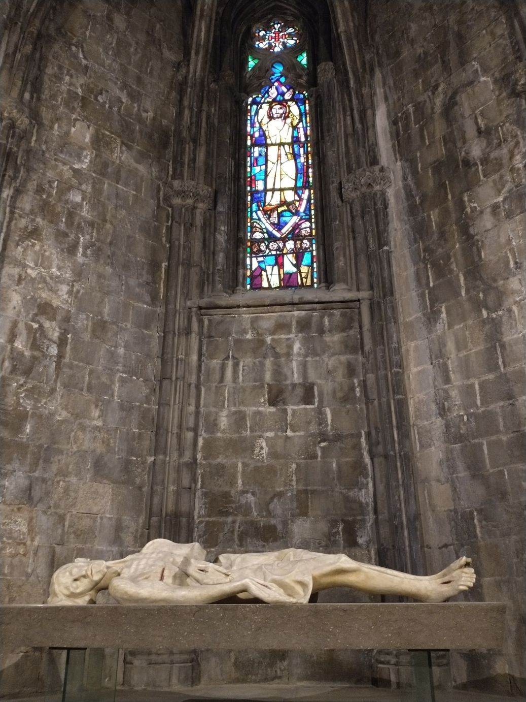 After our visit we wander through the gift shop (the only way out – of course – just like the airport – don’t miss a chance to force you to shop!!!), looking at some really cool masks and umbrellas fashioned after the new stained glass window. But we pass – we sure don’t need more masks – or more weight from umbrellas! Cold weather traveling is tough on weight restrictions. As we start to leave, we see it is a monsoon outside. Bummer! We wait it out in the little vestibule off the gift shop – and lo and behold – the rain begins to subside. Yay. So we trundle off with our umbrellas, which we only need for about 5 minutes, in search of the Basilica Sant Feliu.