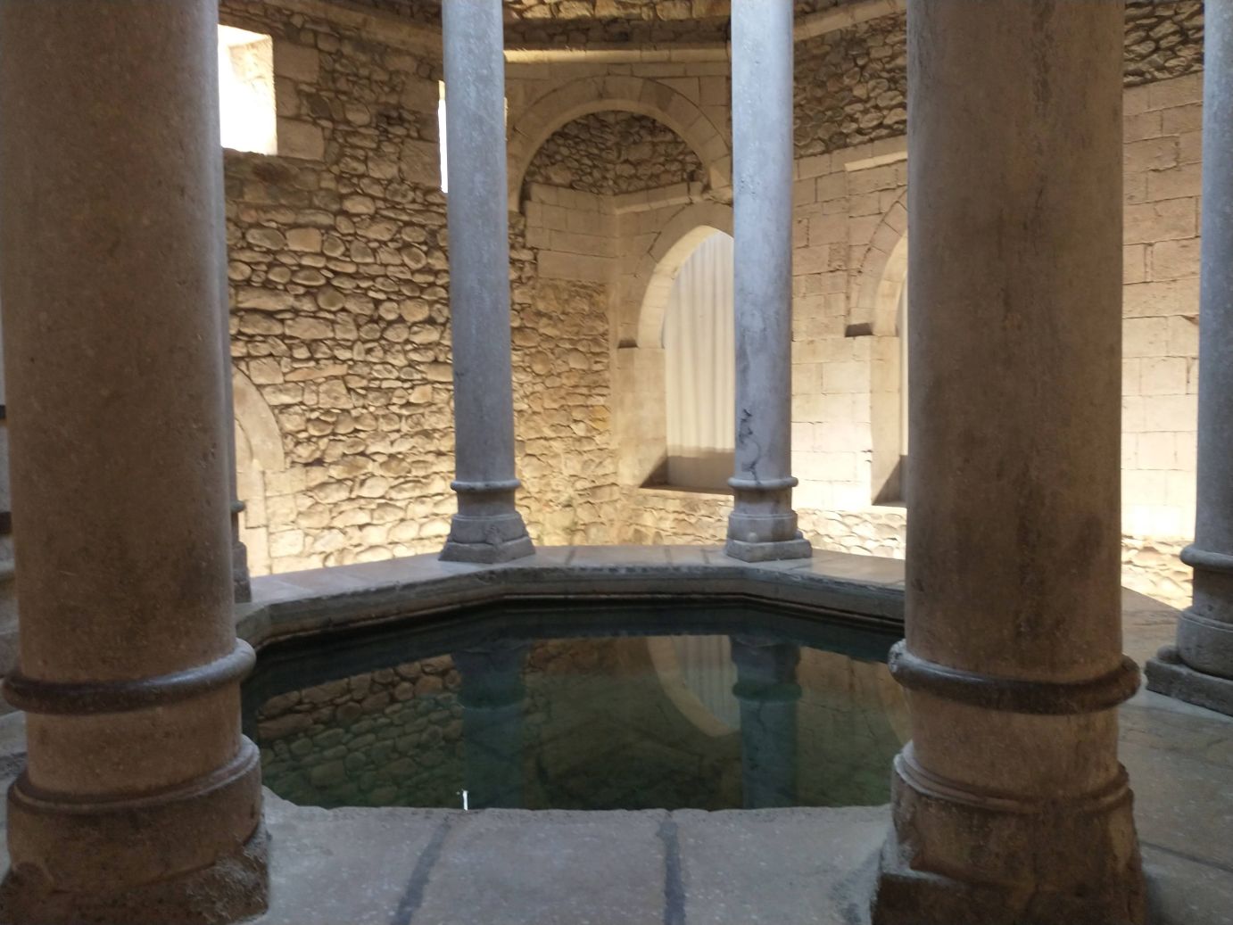 Making short work of the museum, we move on to the Arab baths – which are right around the corner, past a lovely overgrown river/moat type area. The baths were built in 1194 in the Romanesque style of so many at the time. Supposedly they were built in an effort to improve the hygiene of the Girona populace at the time. Regardless, they are completely picturesque. You can imagine yourself in the hot room and cold room, dipping into the center bath under the arches. The cold rooms are cool – ok – literally – but that’s not what we mean – the way they are cooled, with star and circle shapes cut into the rock ceilings to let the brisk air inside. How did they come up with all this engineering? Amazing.