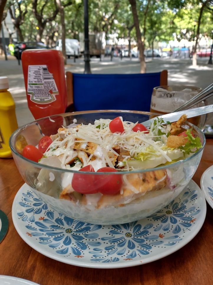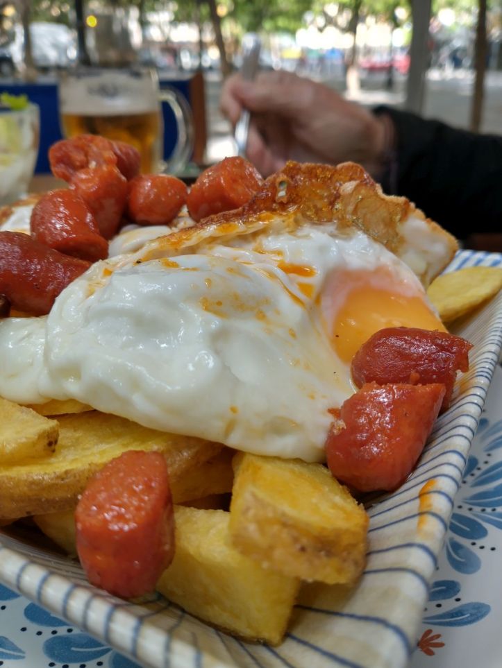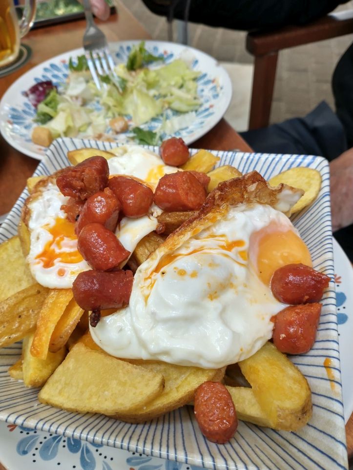 Backtracking into the University area, we stop at one of the restaurants we passed on our way to Kioska, Buenissimo. Good menu, outdoor seating, we’re in. Wine, beer, a huge Caesar salad with chicken and Huevos Rotos (fried eggs on top of French fries with little chorizo links strewn about) – perfect sailaway lunch!