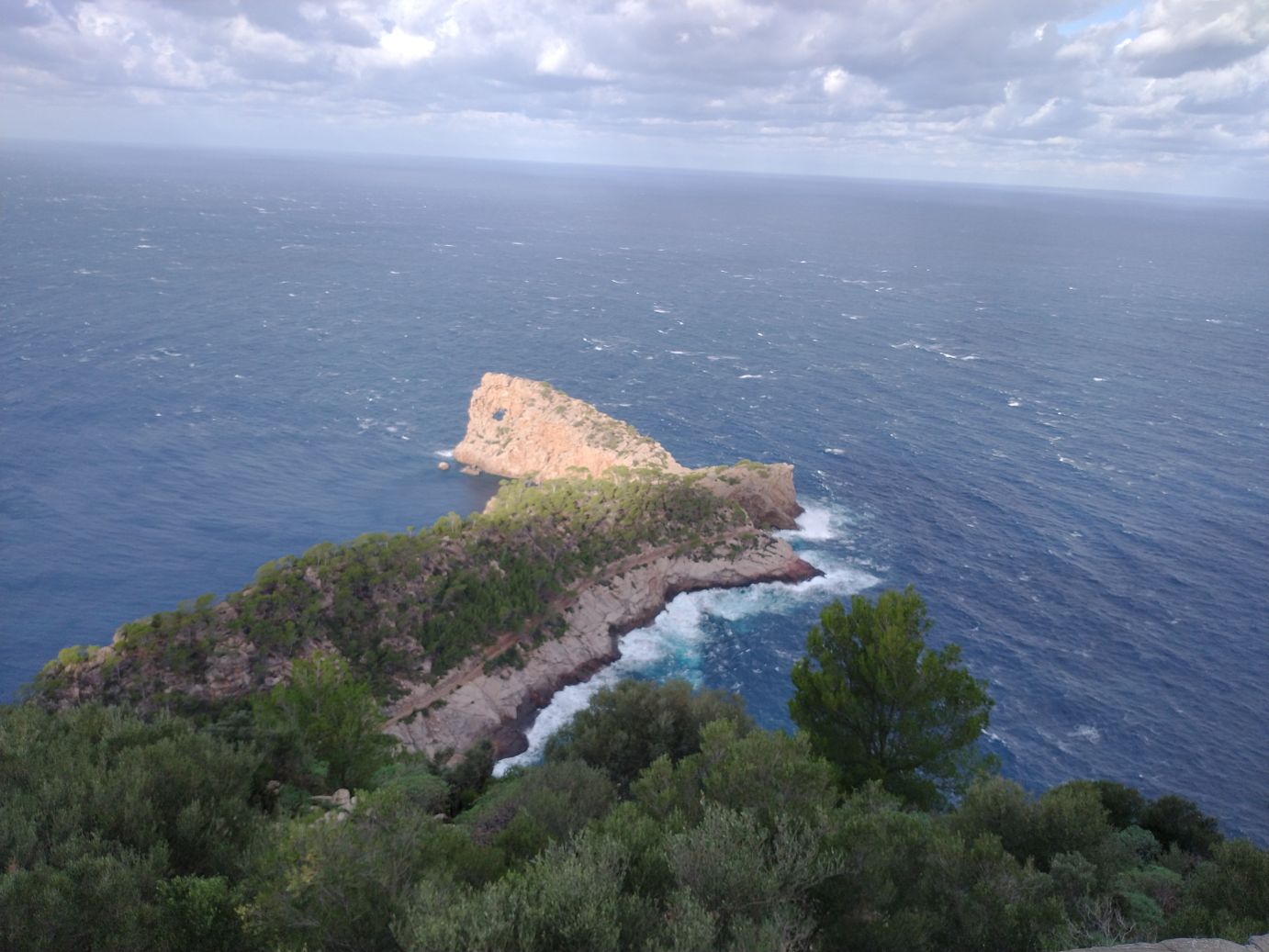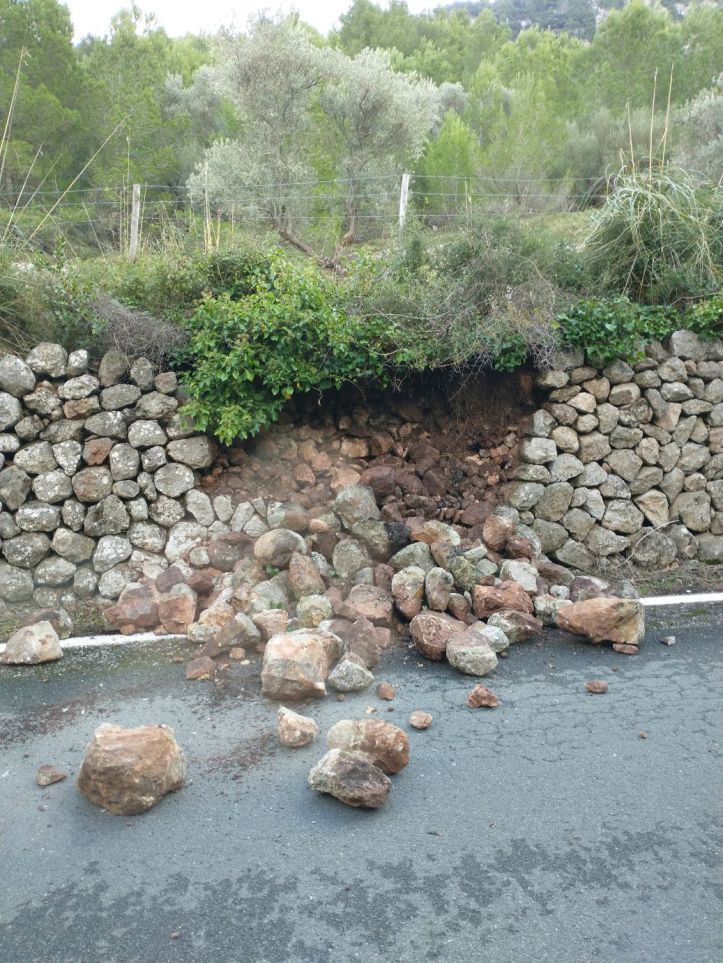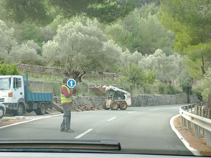 It is a gorgeous clear day, but a really cold puffy coat day – so our hiking may be curtailed, but we’ll see how it goes. Exiting off the autostrada, the roads narrow and start to twist and turn their way up the mountains and along the coast. We pass Valdemossa and keep going to our destination about 15 minutes further on. As we continue to climb, we carefully navigate our way around a rockslide that has left most of the rock wall in the road. Sheesh. That’s a little scary. There have obviously been some heavy storms here – and the ground is soaked, lots of water running off the hills and, of course, the rockslide.