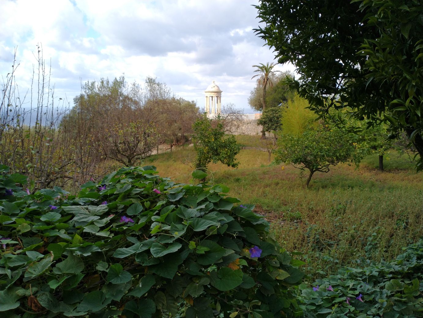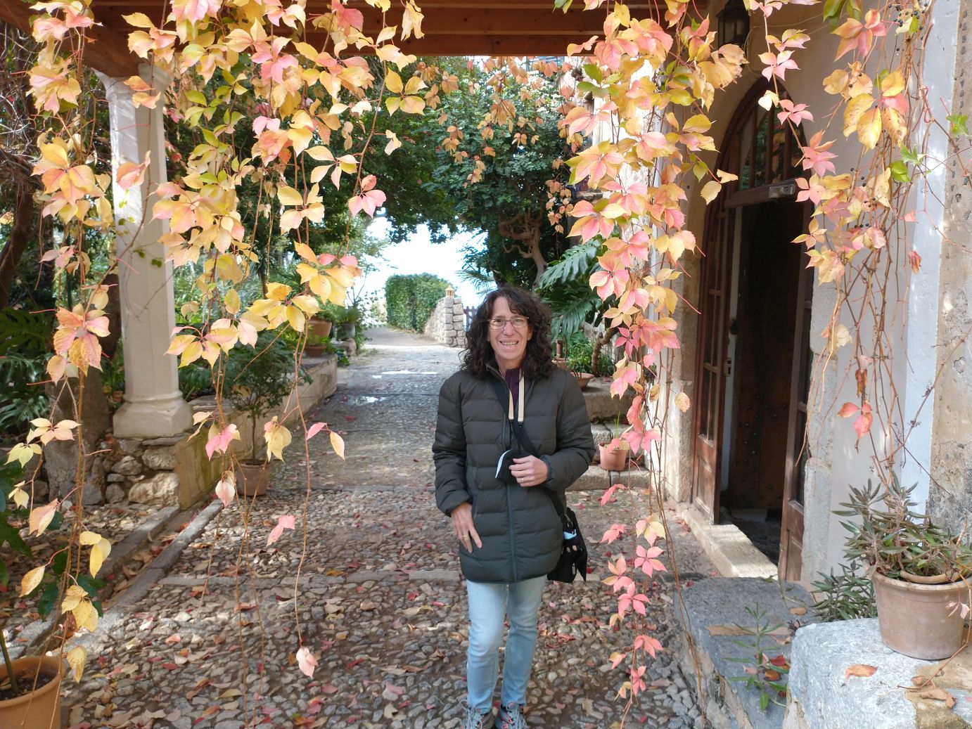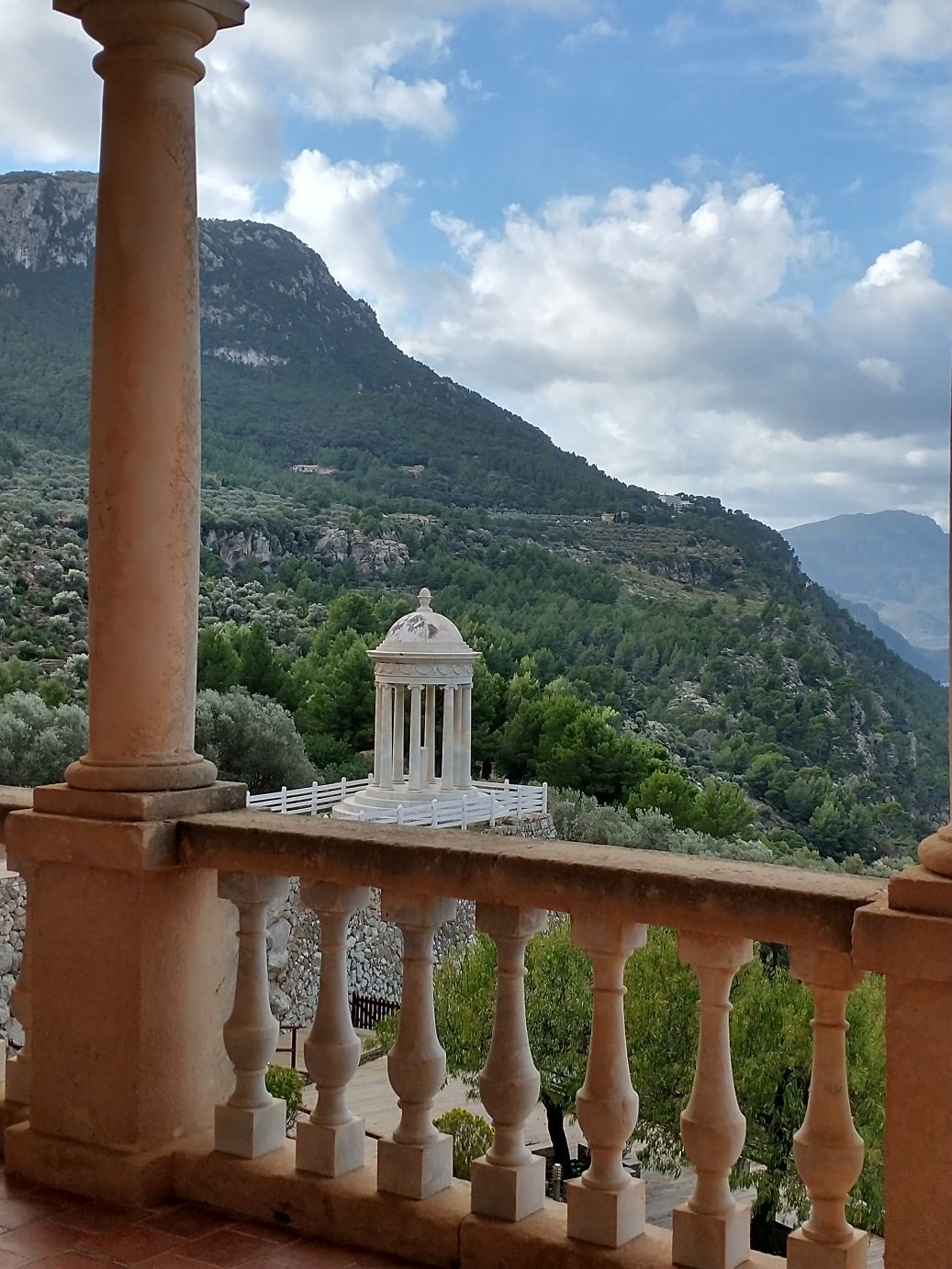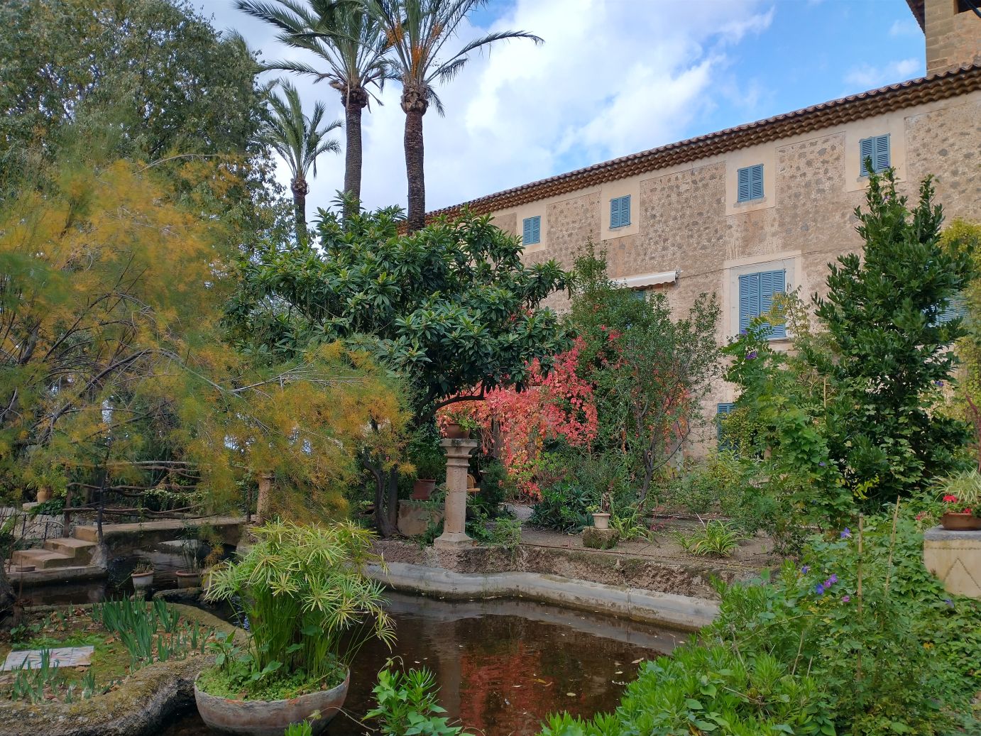 The house is interesting in and of itself, but the gardens are the real attraction – at least for us. The views over the Mediterranean are spectacular and the gardens themselves are lush, even in Fall/Winter season. The Grecian type gazebo perched at the edge of the cliffs is a perfect place for photos (Sunny even gets into the mood), as are the little pond, the geese and ducks and the trellis turning colors in the cold temperatures. Wandering through the gardens for 10, 20, 30 minutes is a lovely way to finish our visit to Son Marroig – a good substitute for hiking to Sa Fordada,
