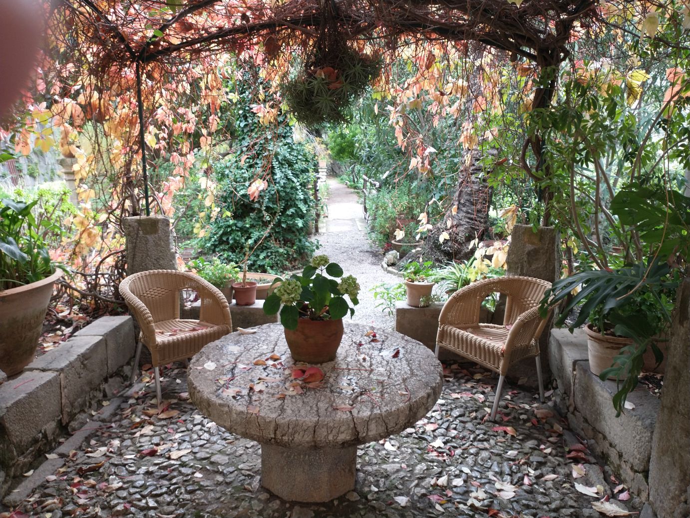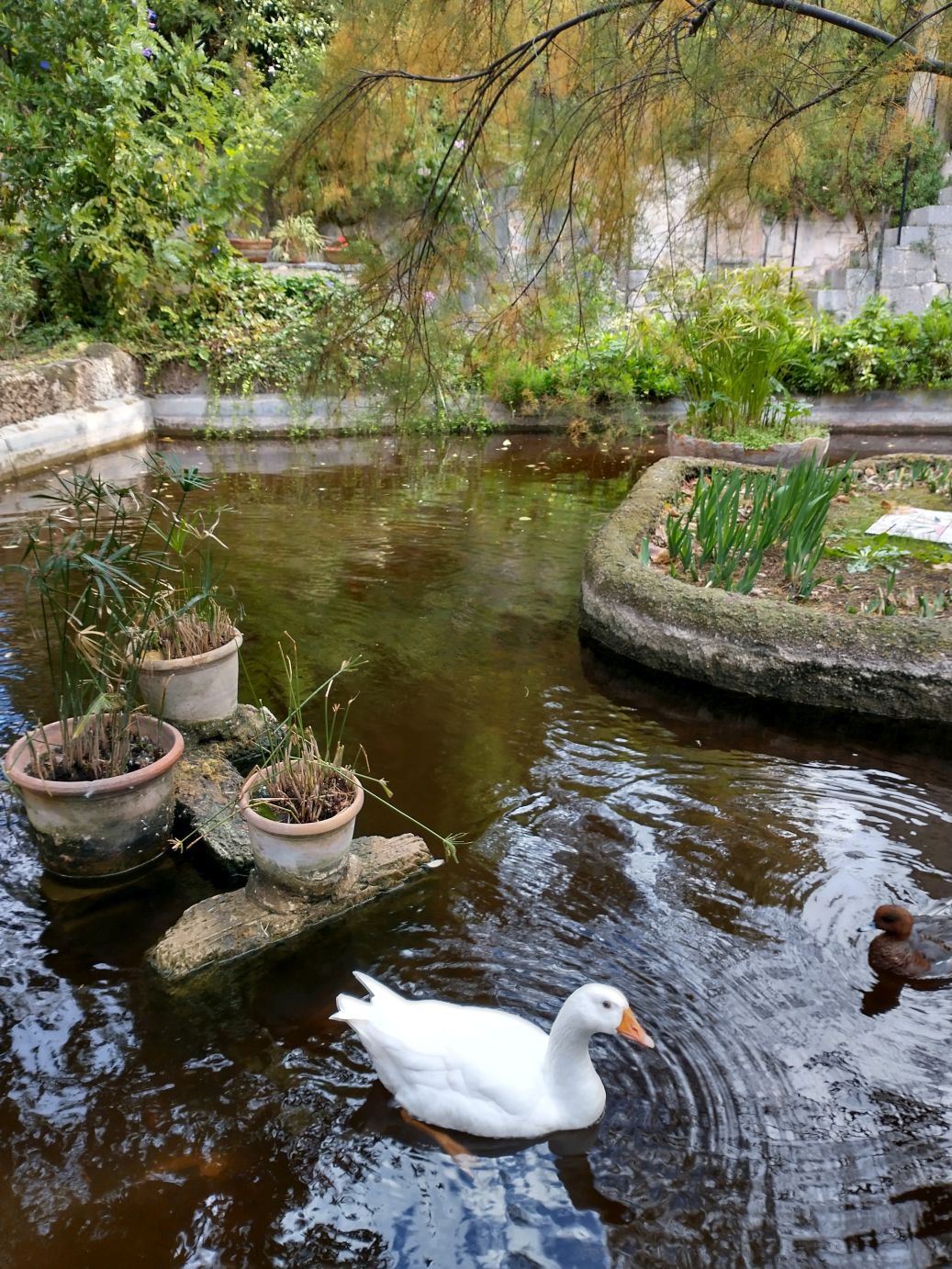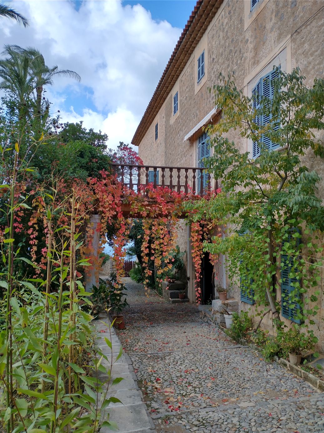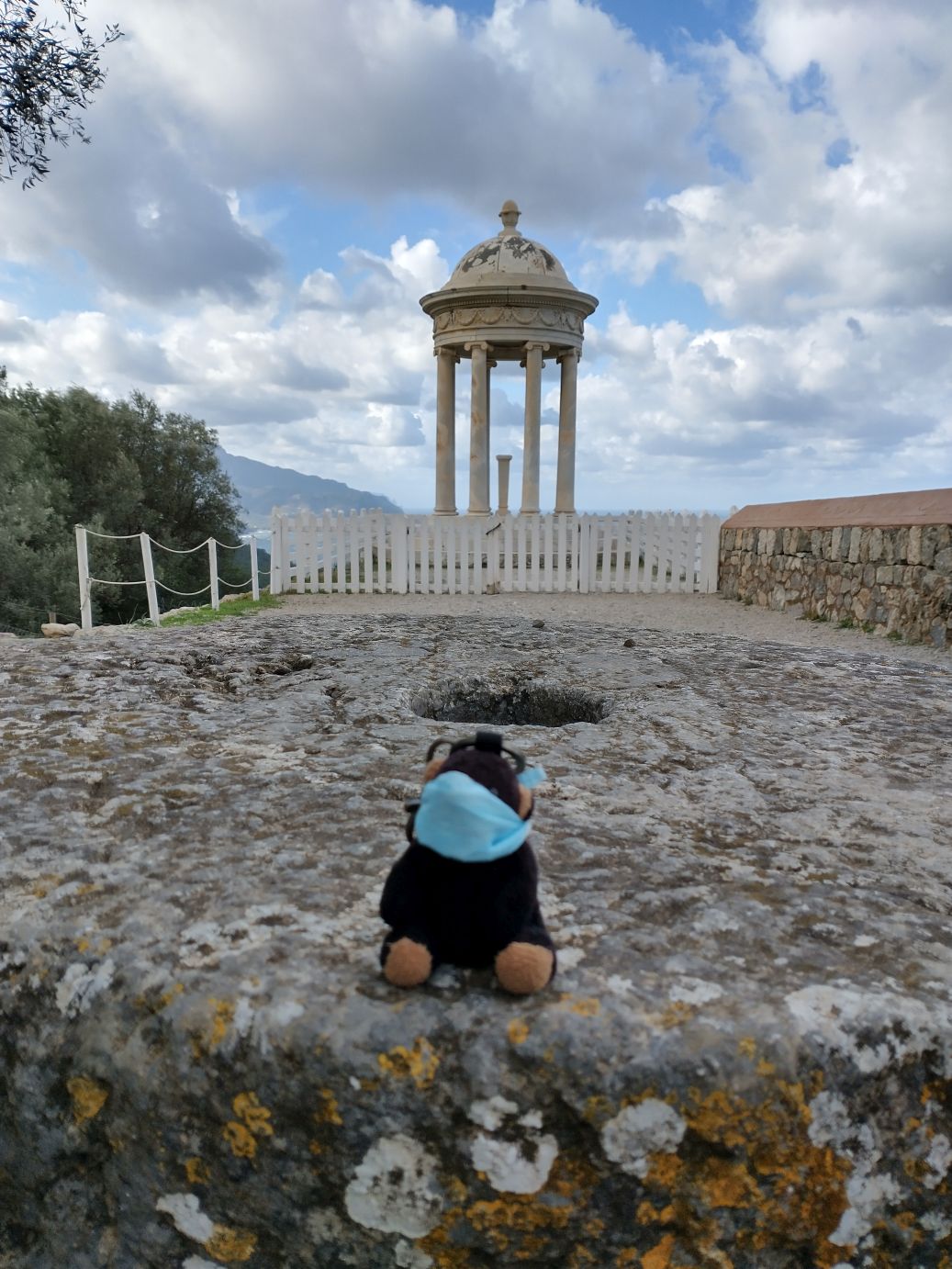 The house is interesting in and of itself, but the gardens are the real attraction – at least for us. The views over the Mediterranean are spectacular and the gardens themselves are lush, even in Fall/Winter season. The Grecian type gazebo perched at the edge of the cliffs is a perfect place for photos (Sunny even gets into the mood), as are the little pond, the geese and ducks and the trellis turning colors in the cold temperatures. Wandering through the gardens for 10, 20, 30 minutes is a lovely way to finish our visit to Son Marroig – a good substitute for hiking to Sa Fordada,