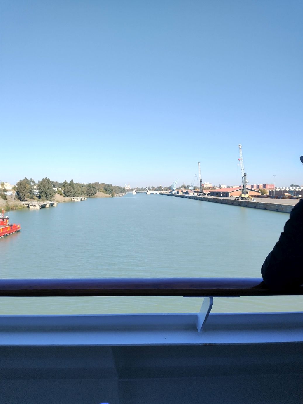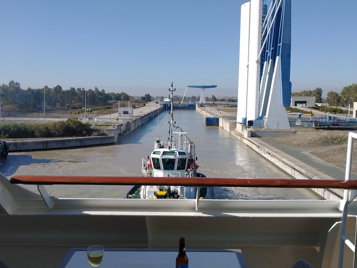 This is absolutely why we upgraded to the Aft Balcony cabin! It will take us 6 hours to sail up the river to Seville, the last 2 miles of which we have to back up! The Captain will be turning the ship in this little narrow basin and we’ll have the prime spot for viewing it all. So exciting!