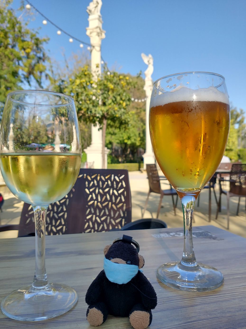 Rising up to street level right before the port, we cross around the huge roundabout with the cool fountain and obelisk in the center to enter into the park. It is a lovely walk through the treelined paths that skirt the main park but keep us sheltered from the main road. Wending our way through the different foliage, we eventually emerge upon the Plaza de America, where the museum is located. Strategically situated right at the beginning of the plaza though is a lovely little café where we can indeed get a local beer and wine before moving on to our museum explorations. Couldn’t be a better spot actually. We’re in the sun. We’re bracketed between parkland and majestic museum buildings. We have beer and wine. What could be more perfect?