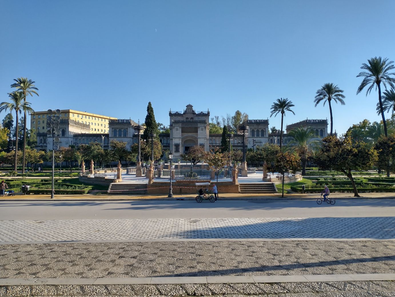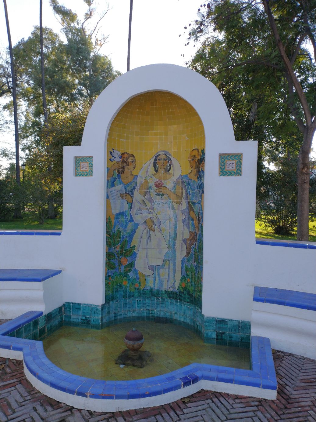 Finally prying ourselves (me) away, we go back out into the streets, marveling at all the tile work on the buildings surrounding the museum, then exploring the pedestrian area filled with restaurants and cafes. Nothing really strikes our fancy, and we’ve already had lunch, so we just cross back over the bridge to the other side of the river with its scenic views down the Guadalquivir, heading toward the Parque de Maria Luisa to visit the Museo de Artes y Costumbres Populares (Museum of Arts and Traditions).