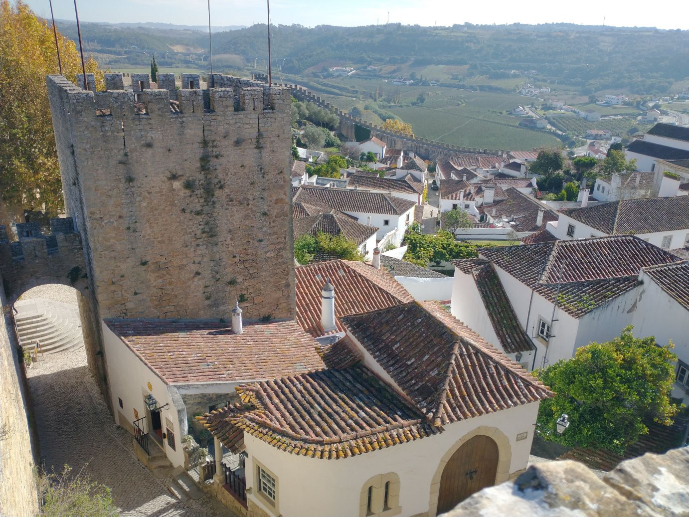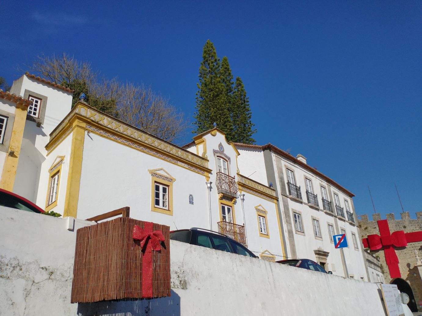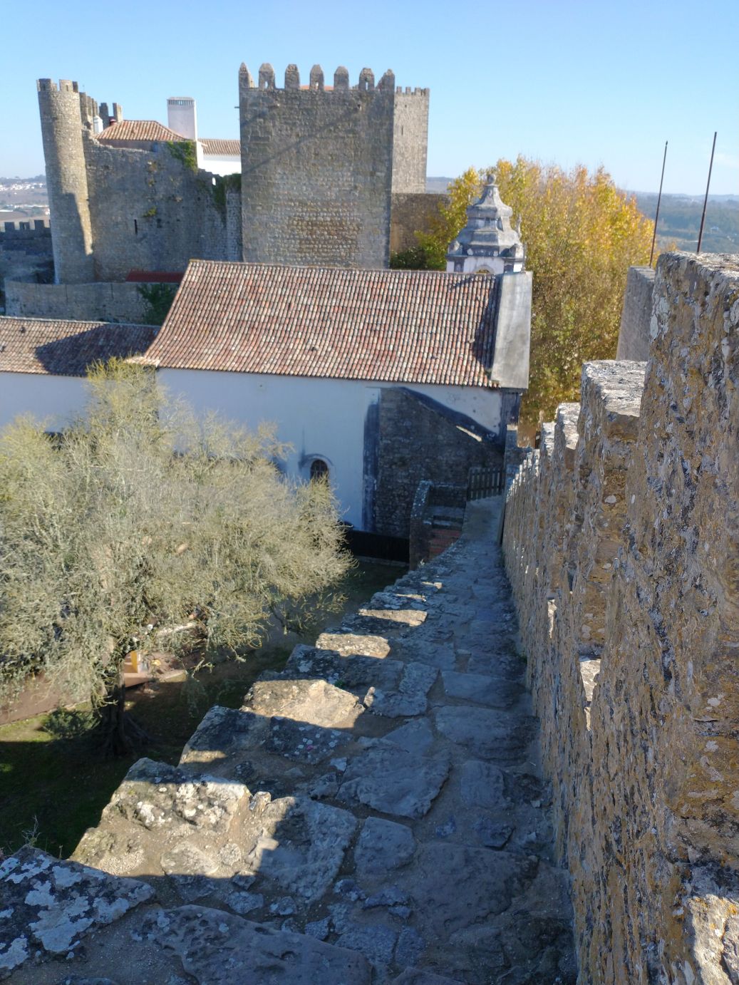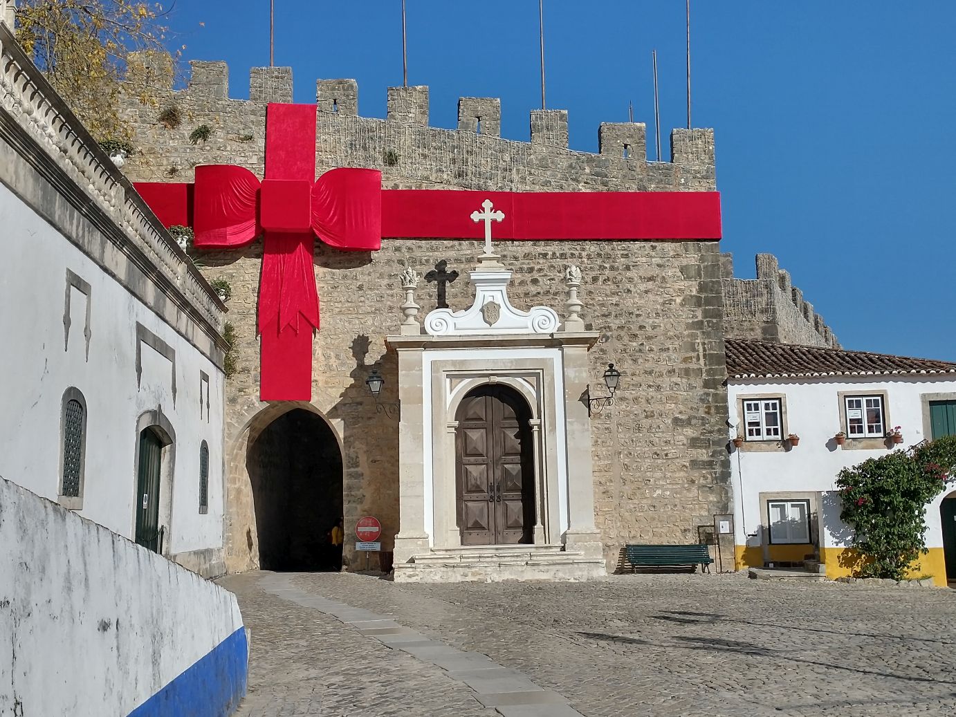 Obidos is a perfectly preserved example of medieval architecture contained in a small walled town. As time progressed, Gothic and Renaissance styles were added, but mostly what you see here are the old stone walls, houses and structures of the medieval times. Entering through the town gate, adorably decked out in a red Christmas bow, we gaze up at the beautiful, tiled chapel on the balcony level of the gate, then immediately turn left and climb up the stairs to the ramparts and the walls. We can circle the entire town up here on these walls but are planning to descend at the opposite end by the castle turned hotel.