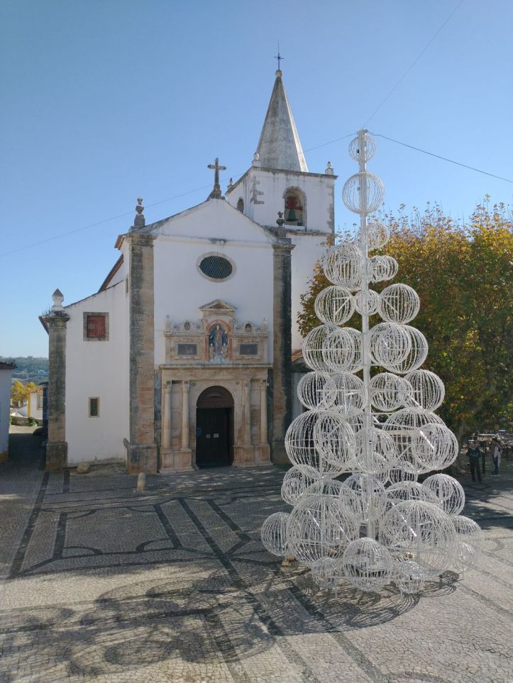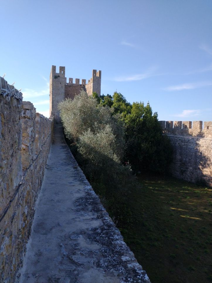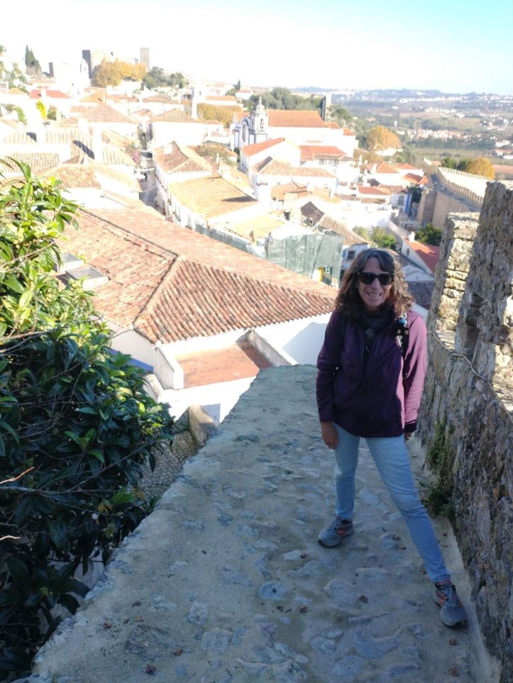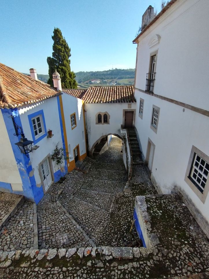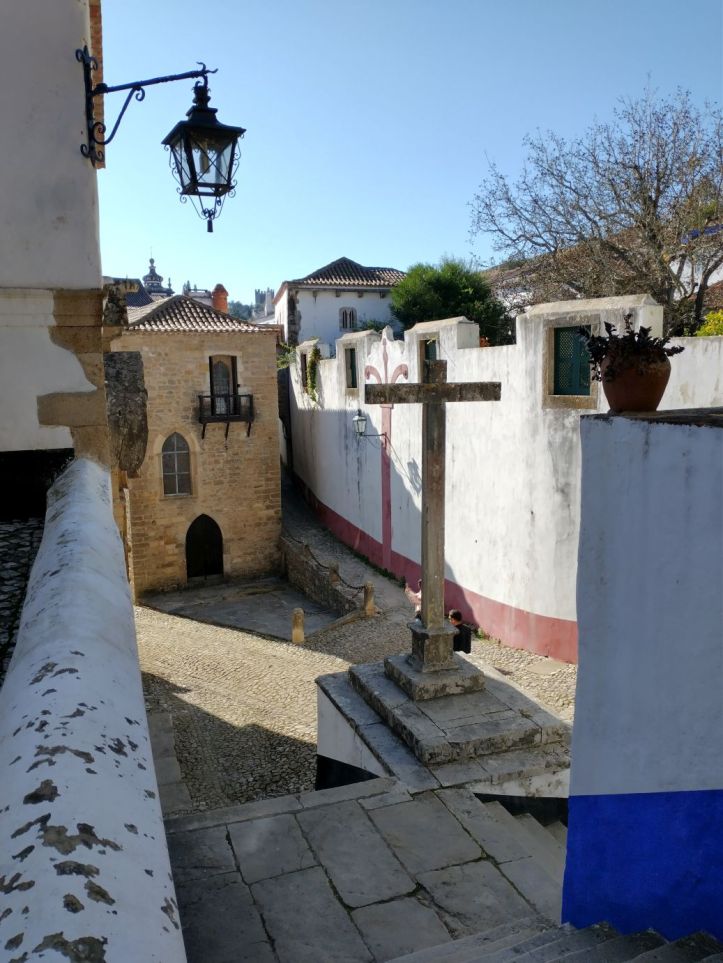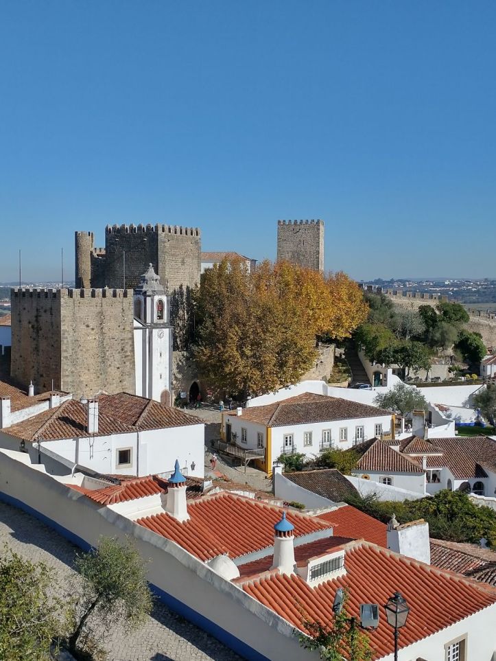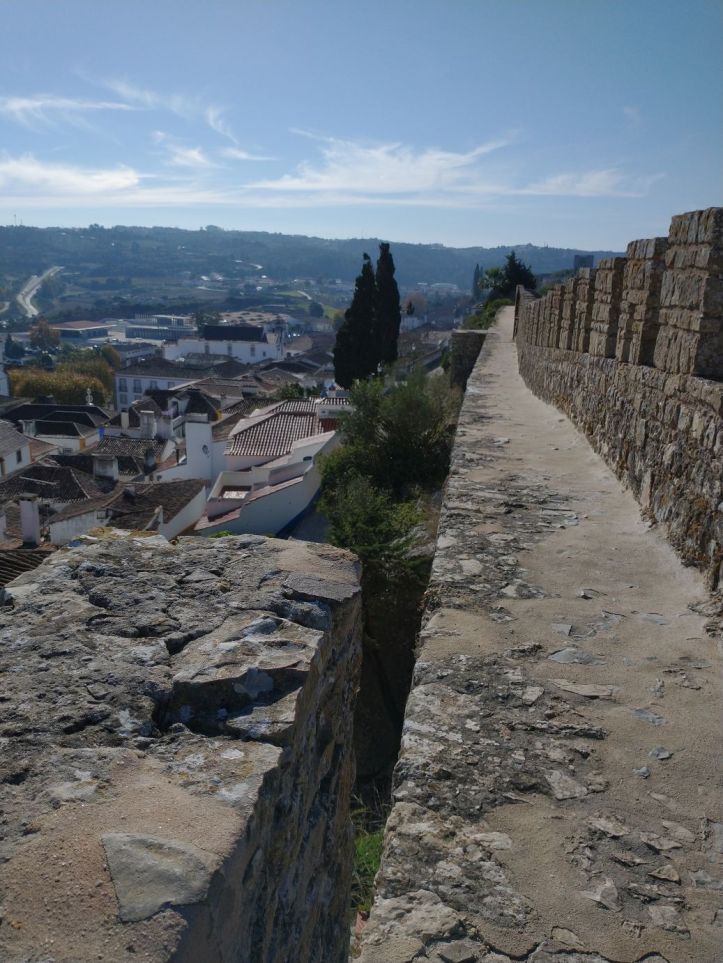 Obidos is a perfectly preserved example of medieval architecture contained in a small walled town. As time progressed, Gothic and Renaissance styles were added, but mostly what you see here are the old stone walls, houses and structures of the medieval times. Entering through the town gate, adorably decked out in a red Christmas bow, we gaze up at the beautiful, tiled chapel on the balcony level of the gate, then immediately turn left and climb up the stairs to the ramparts and the walls. We can circle the entire town up here on these walls but are planning to descend at the opposite end by the castle turned hotel.