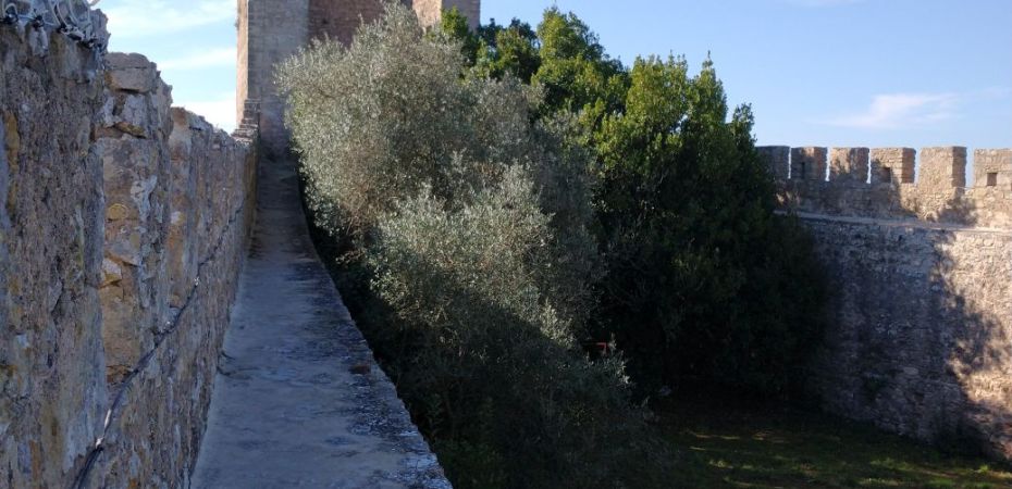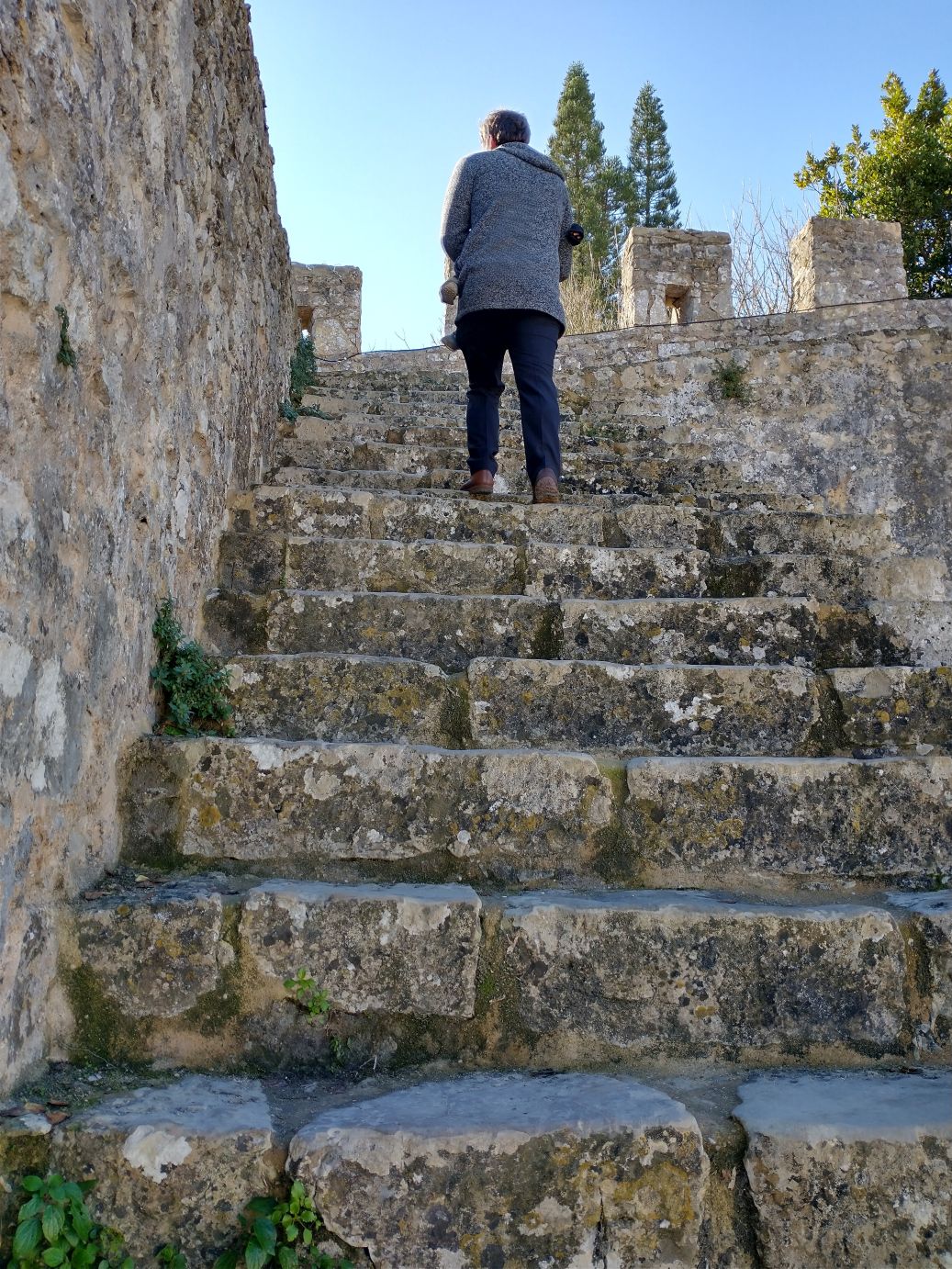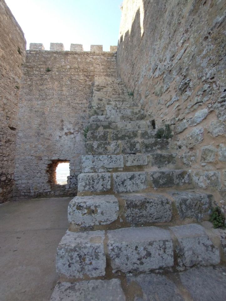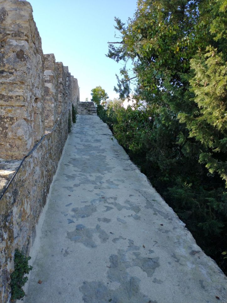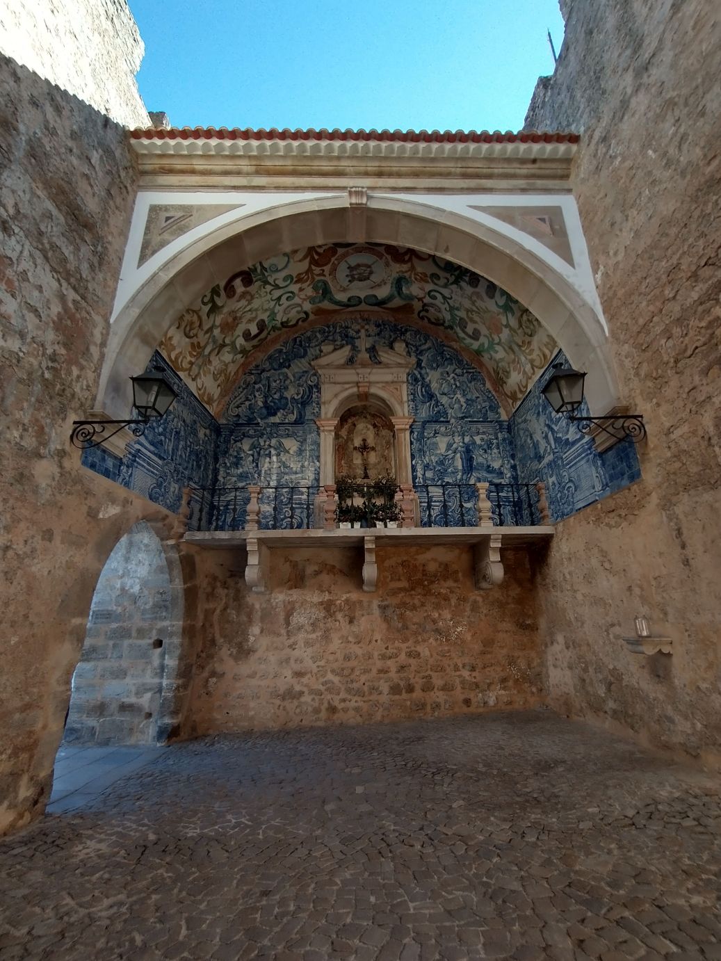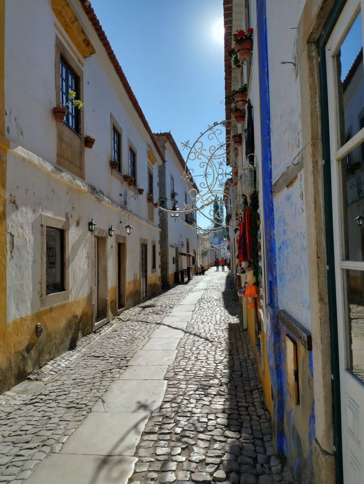 Obidos is a perfectly preserved example of medieval architecture contained in a small walled town. As time progressed, Gothic and Renaissance styles were added, but mostly what you see here are the old stone walls, houses and structures of the medieval times. Entering through the town gate, adorably decked out in a red Christmas bow, we gaze up at the beautiful, tiled chapel on the balcony level of the gate, then immediately turn left and climb up the stairs to the ramparts and the walls. We can circle the entire town up here on these walls but are planning to descend at the opposite end by the castle turned hotel.