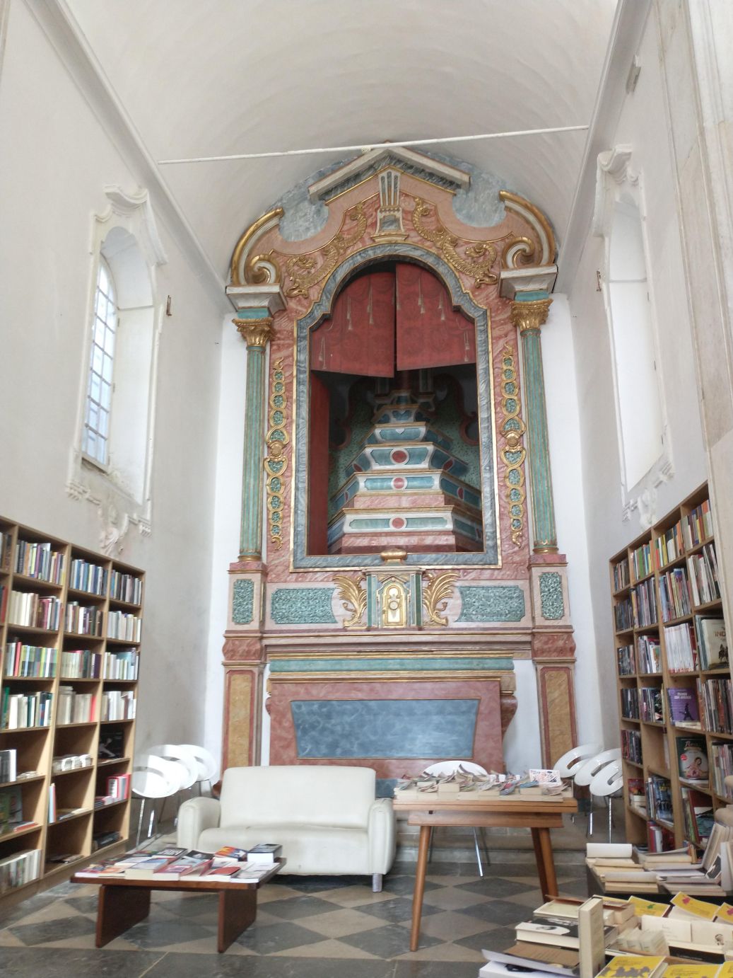 The town, on ground level, is just as beautiful as from above, with the ancient cobblestone streets and sturdy stone buildings. We visit the old Igreja de Santiago, the Church of St. James, which has been converting into a quirky little bookstore, with the altar and altarpiece still intact, only now just surrounded by books.