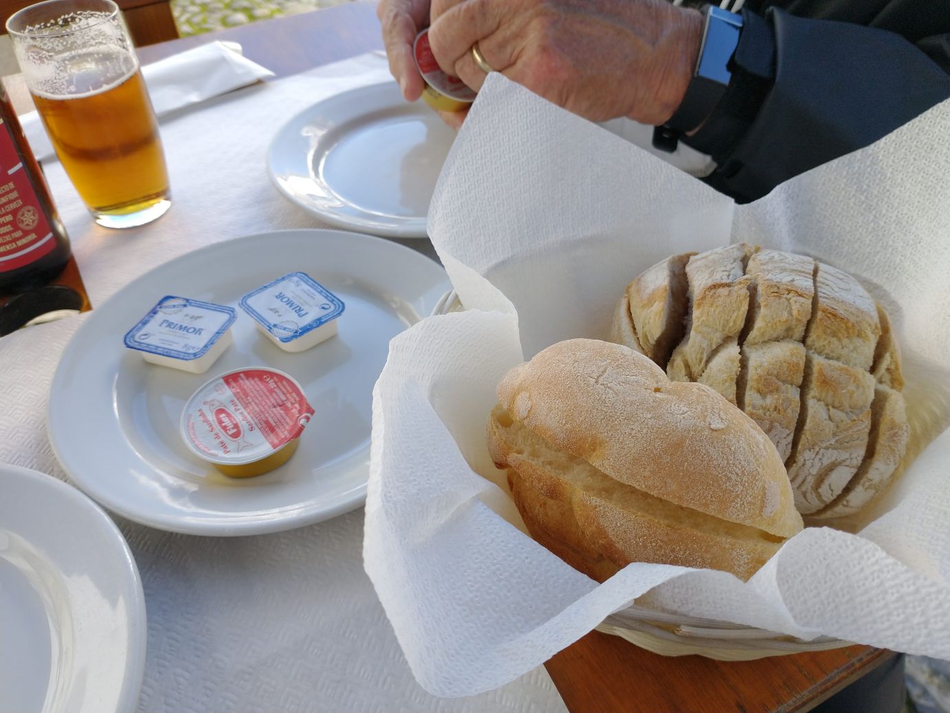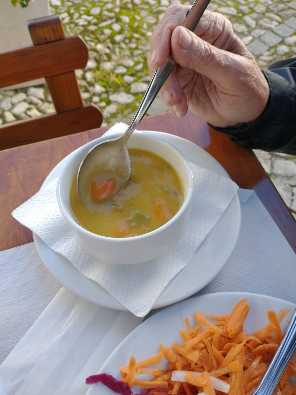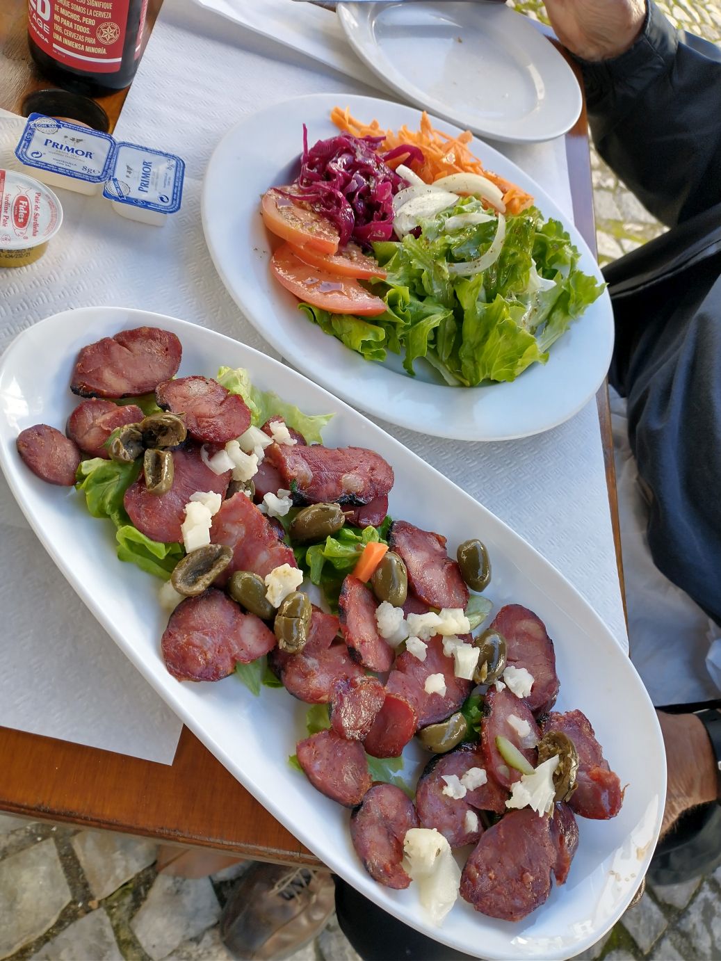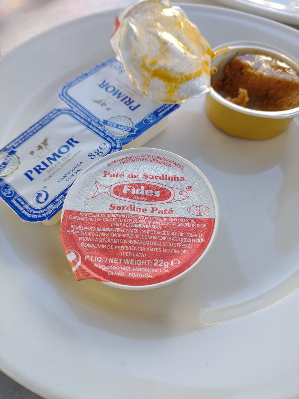 Finally, down a little lane and a few set of stairs, on the side of the Igreja de Sao Pedro, we find the 1 de Dezembro café, with lots of tables outside and a perfect setting in the quiet square well off the main Rua Direita. A perfectly peaceful and lovely place to eat our lunch of bread (of course), sardine pate (sardines are a thing here – there is even a whole store with canned sardines which we unfortunately succumb to with the purchase of 2 tins of something we’ll probably never eat), salad, mixed chorizo and vegetable soup for Ed. Excellent (well except for the pate – eh – when in Rome).